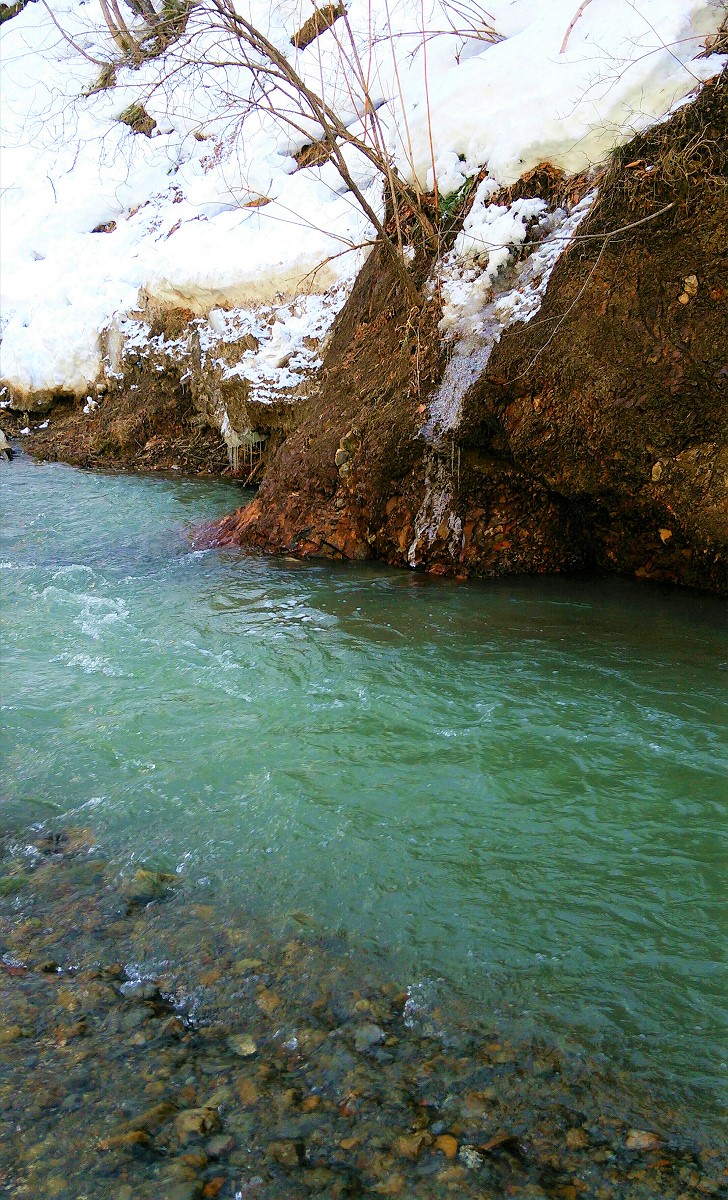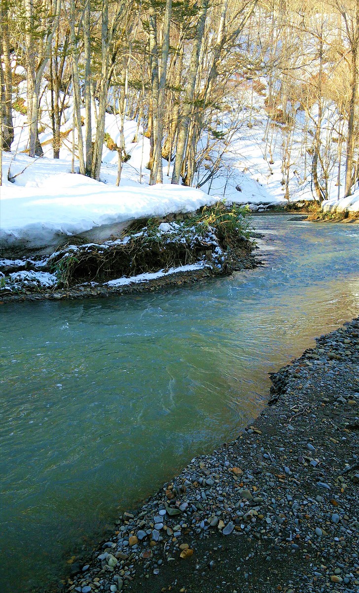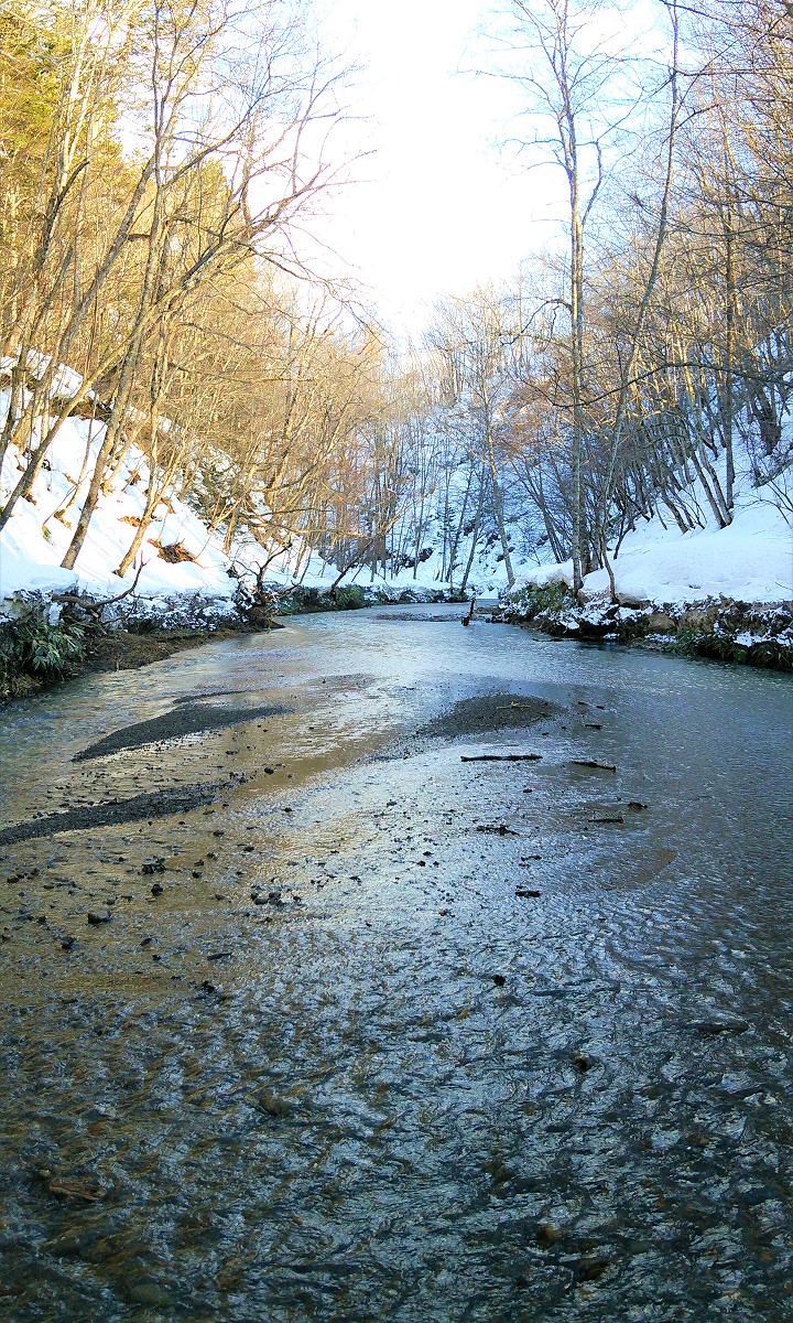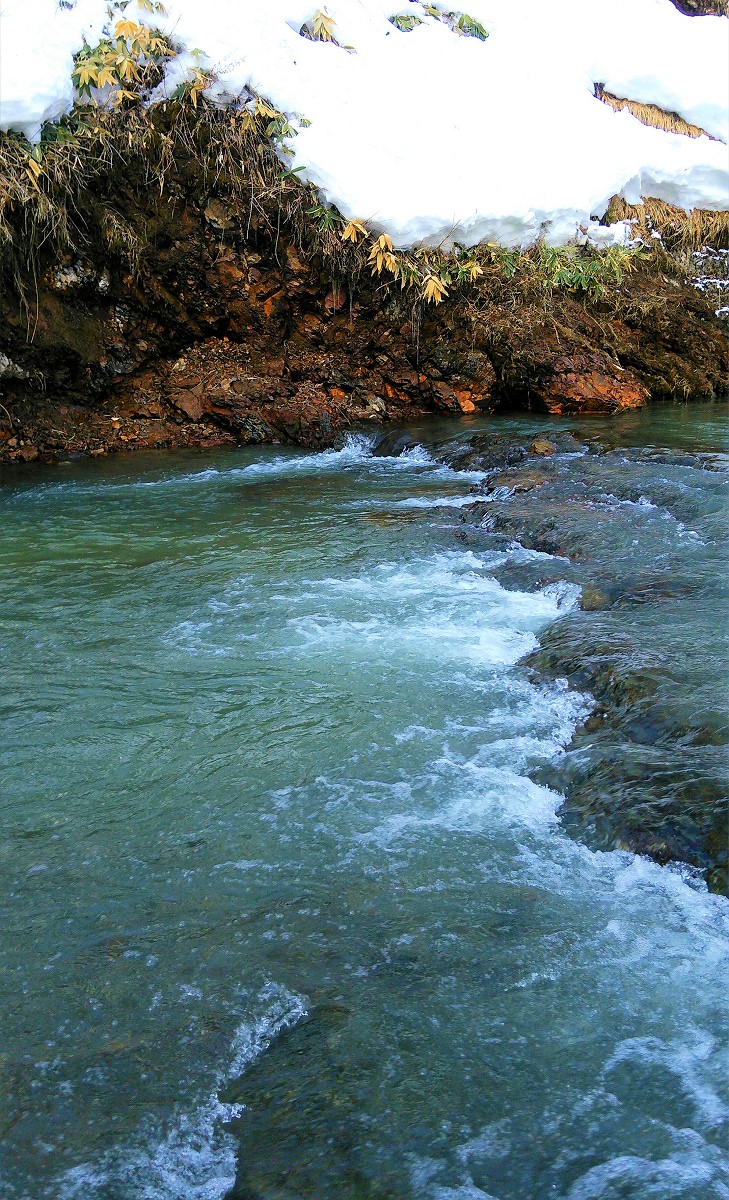それでも惰性で釣り上がっていくと写真のポイントが目に付きました。ただ先程の深場でも釣れなかったのに、この程度のポイントで釣れる訳がありません。しかし投入した仕掛けからは冬の渓流釣りとは思えない手応えが伝わってきました。一瞬根掛かりかと思いきや