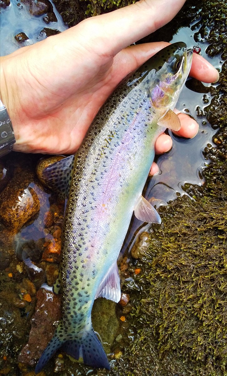 27センチのニジマスがヒット。遡行も入渓も厳しいのでよく釣れます。