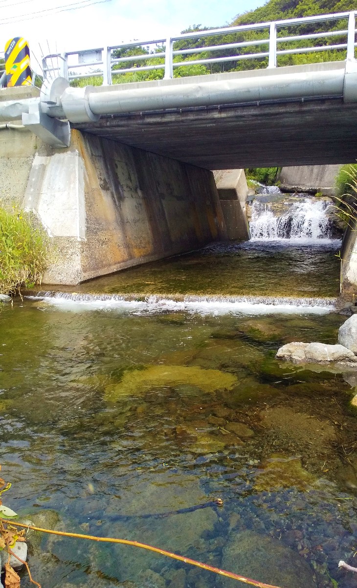 河口の橋の下はコンクリート固めで浅く、すぐ上流は滝になっています。これでは大型魚が遡上するのは不可能と感じつつ、念のため仕掛けを投入すると鋭いアタリがありました。こんな海の近くで何事かと思いきや
