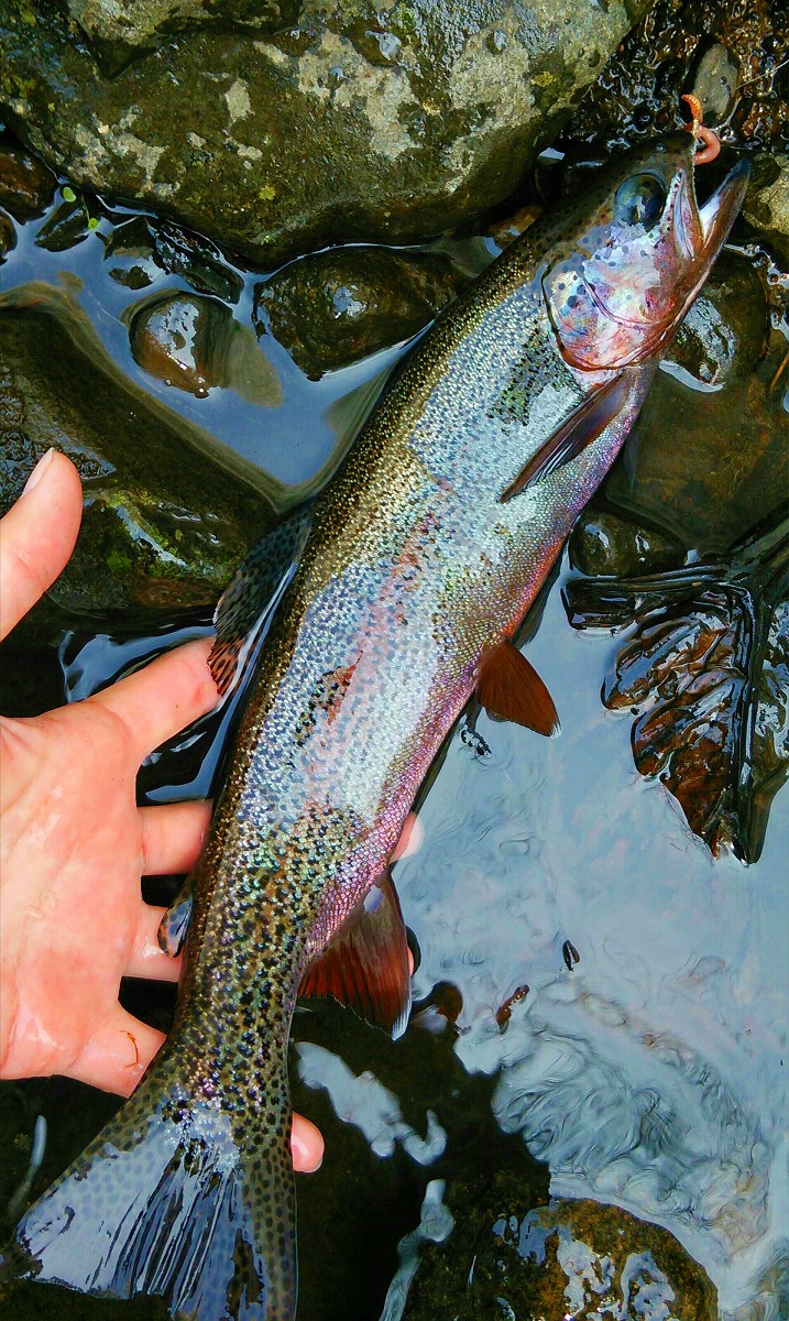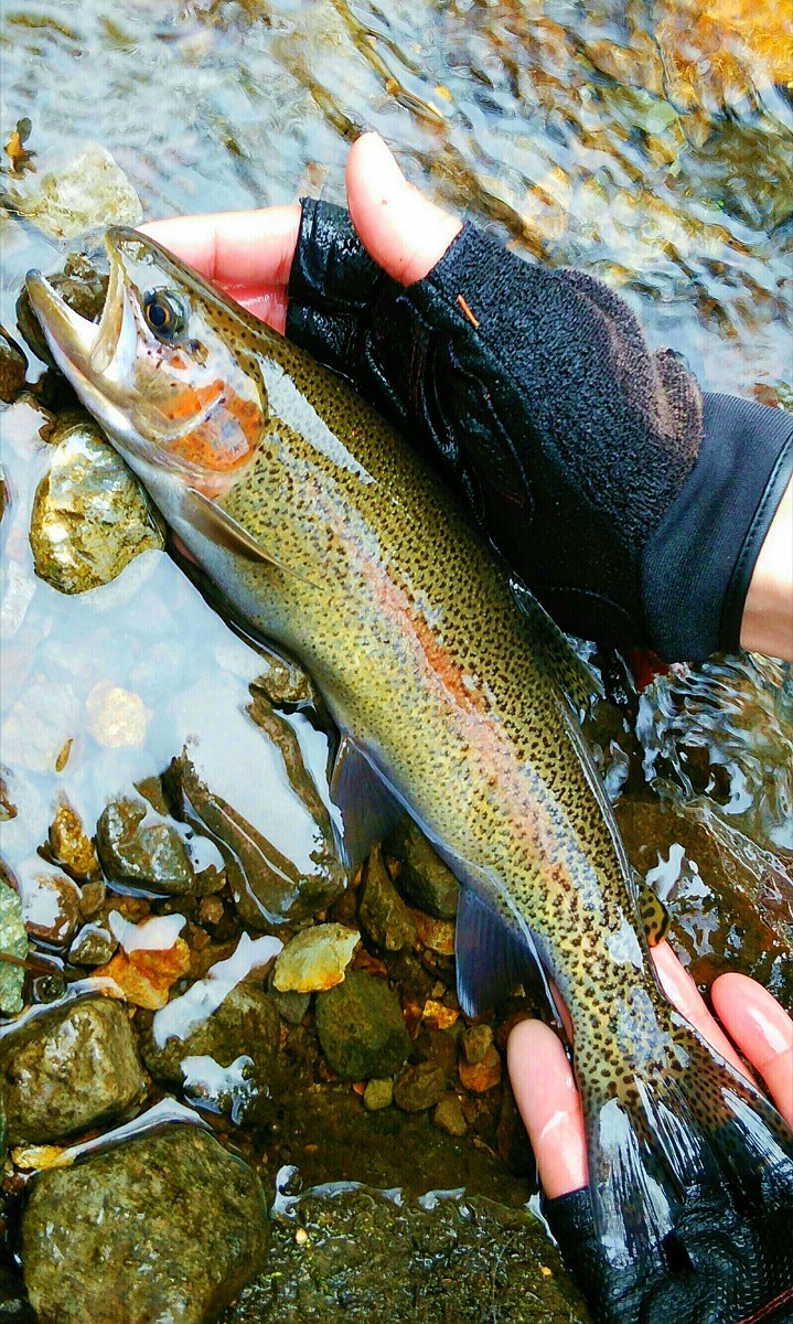 37センチの赤黒いワイルドレインボーでした。ダム下の流れの中で逞しく命を繋いできた風格を感じさせる見事なニジマスですね。