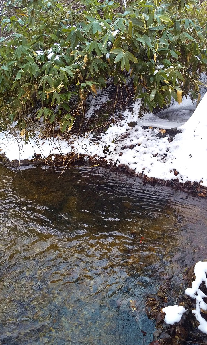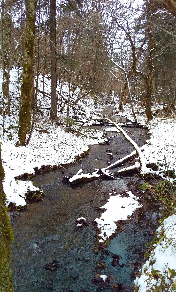 小さなニジマスの生息を確認。という訳で今回はT字路から上流を調査してみましょう。