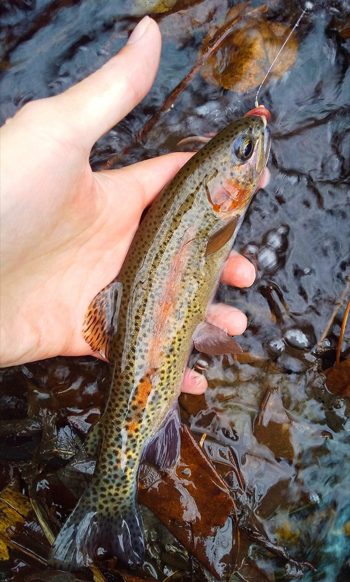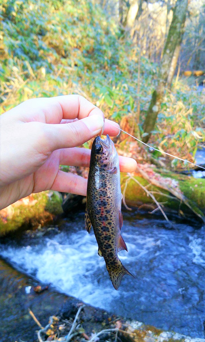 20センチのニジマスがヒット。この川のニジマスは斑点が多くて鮮やかですね。