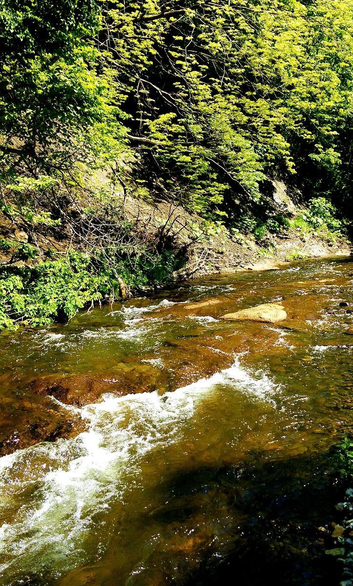 滝のポイントに見切りを付け下流に移動すると、三里川という小河川が流れ込んでいます。写真は木で分かりづらいですが合流地点の様子です。三里川はいつも白く淀んでいて良い印象はありません。そんな川との合流地点で釣れる魚は