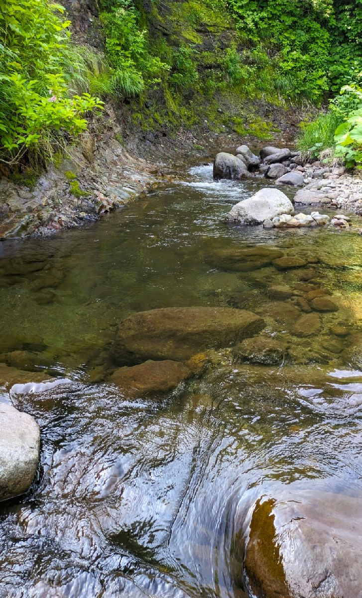 河口周辺は岩盤の川底で浅いものの、少し遡行すると意外に渓流の雰囲気があります。しかし小さなウグイが群れているだけで渓流魚は釣れません。