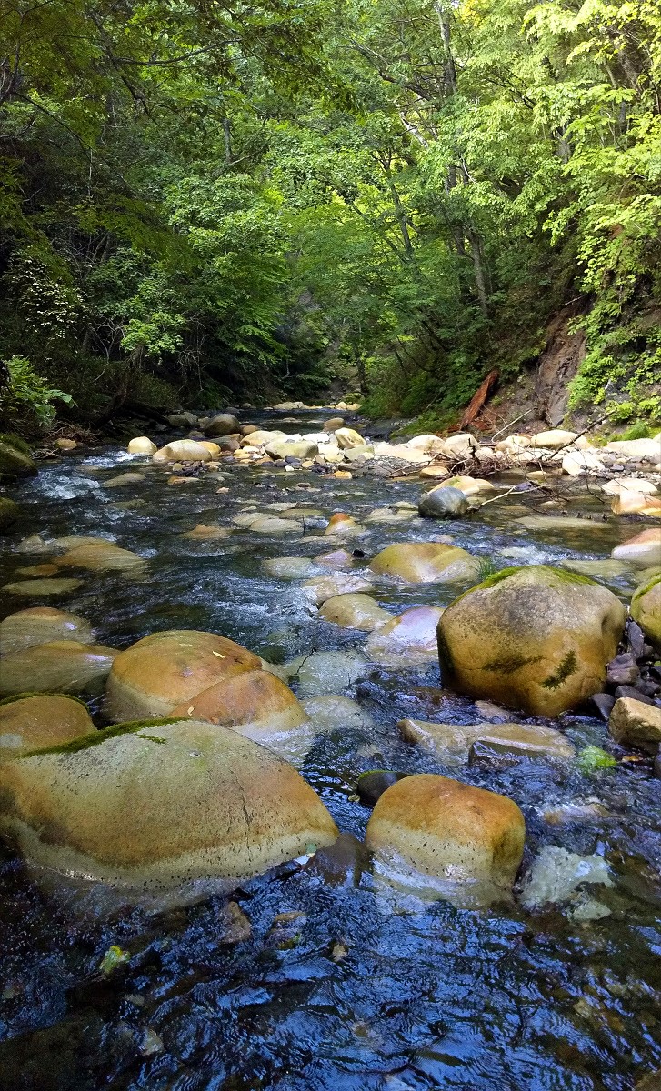 今日は芦別市を流れる尻岸馬内川で釣りをしてきました。河川名は「シリキシマナイガワ」と読みます。川底に点在する白い岩が印象的ですね。