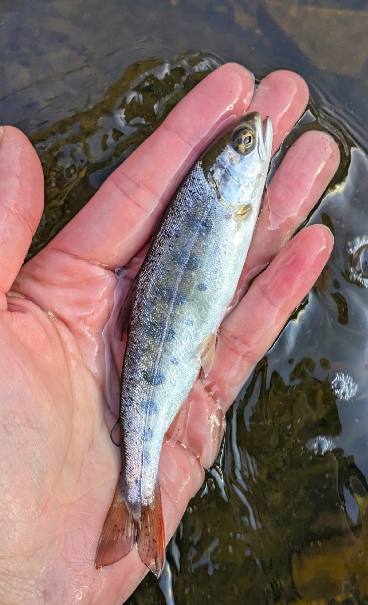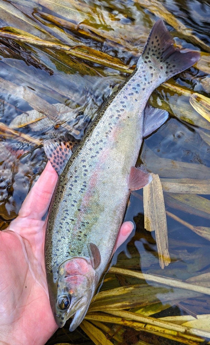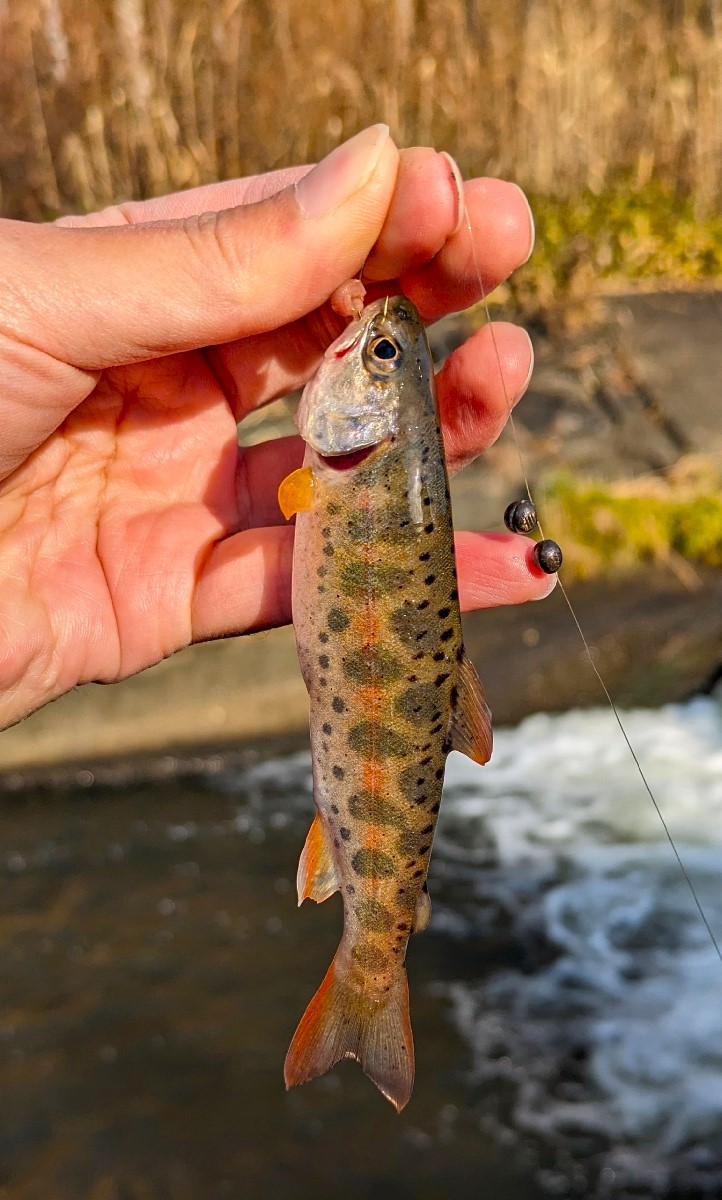 27センチのニジマスがヒット。河川規模を考慮すれば良型の部類でしょう。さらに続けて