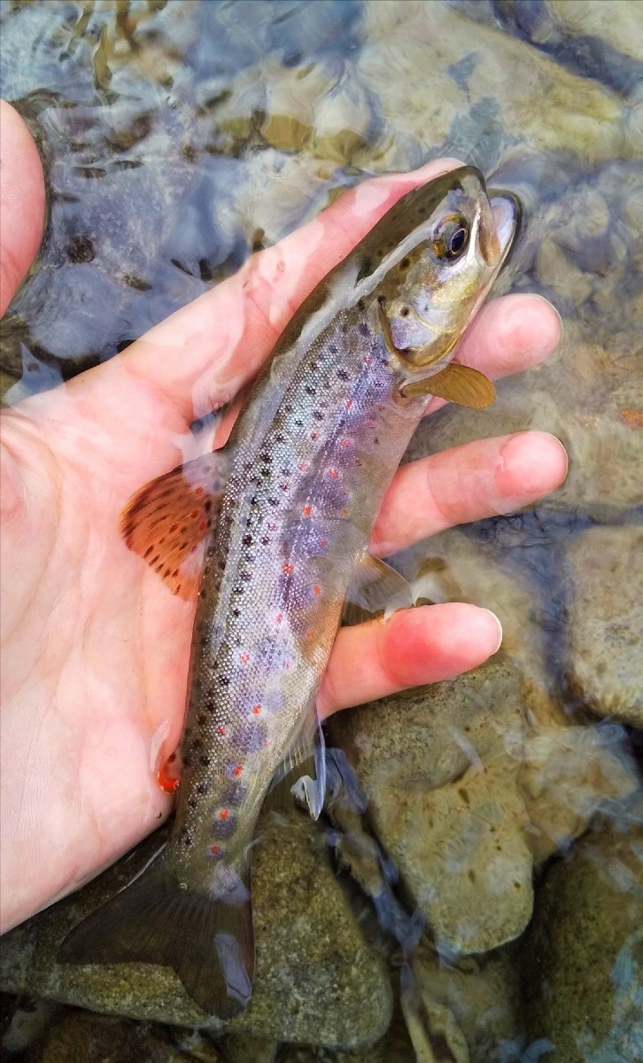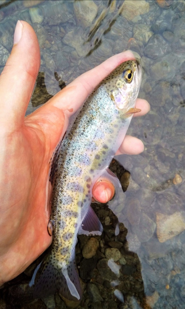 あっさりニジマスがヒット。同じ水系でも盤渓川のニジマスとは遺伝的に異なる白っぽい魚体です。