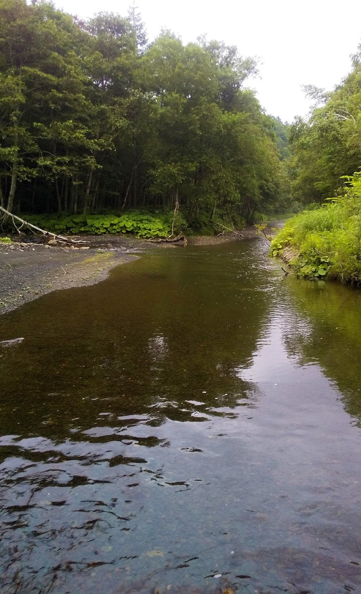 30センチのニジマスがヒット。雨上がりの朝一とは言え運が良いですね。ここから桂沢湖方面へ少し釣り下ってみましょう。