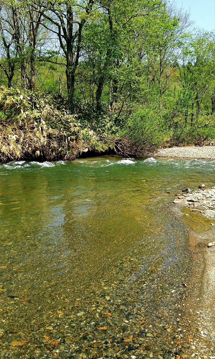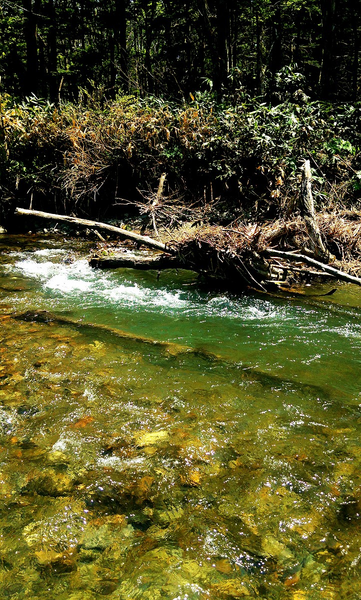 渓相は蛇行と倒木による深場が連続しており素晴らしいの一言に尽きます。ただアタリはなく、魚影が濃い訳ではないようです。