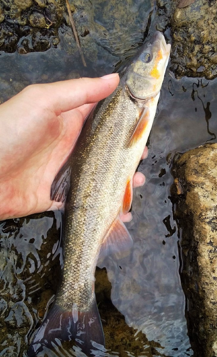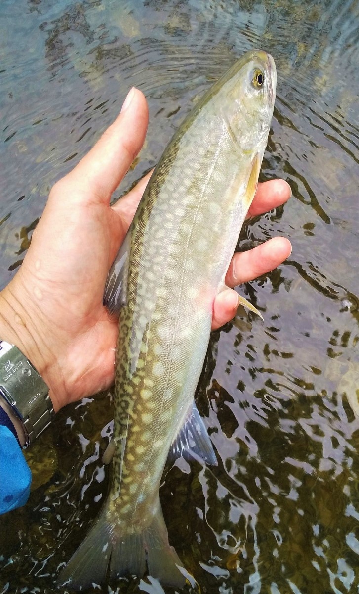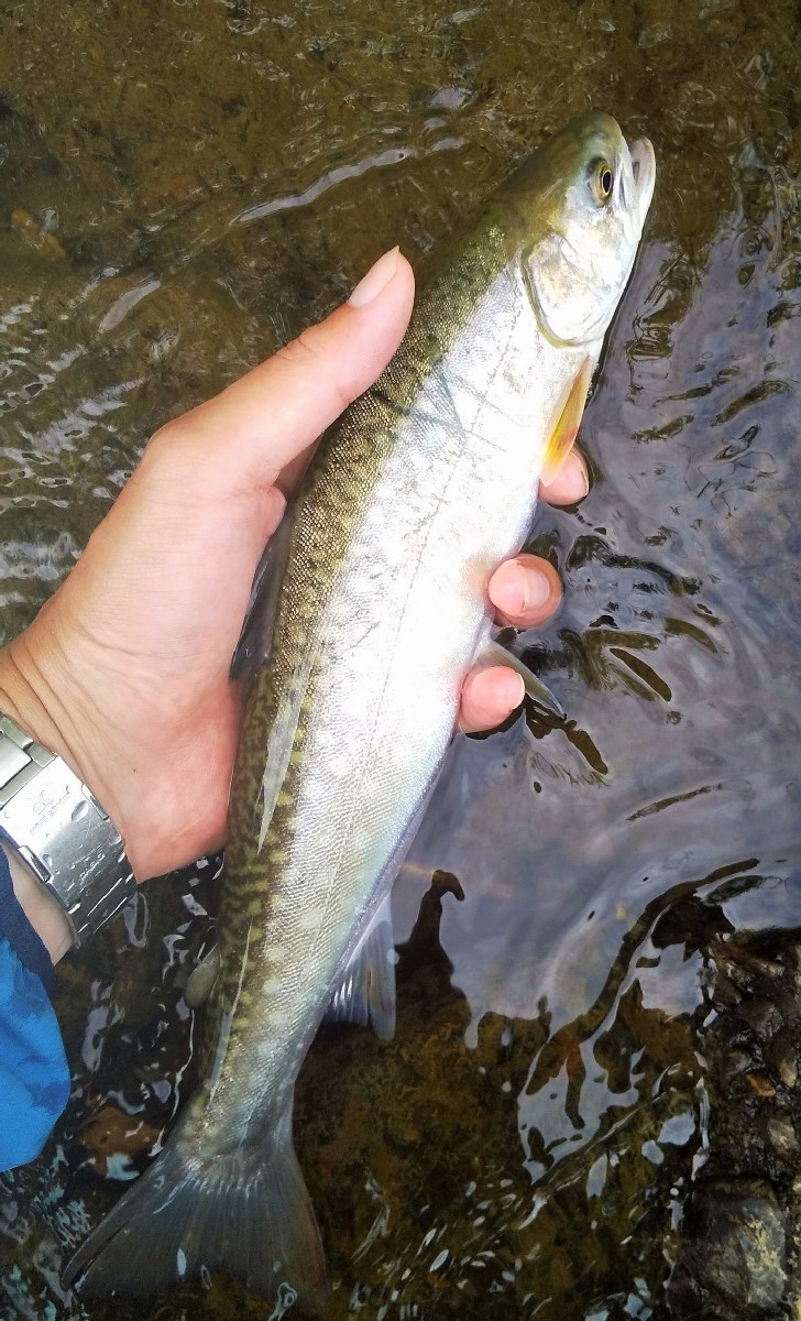 釣れたのは良型ウグイでした。やはり渓流魚の魚影は薄いようです。少し上流に移動しましょう。