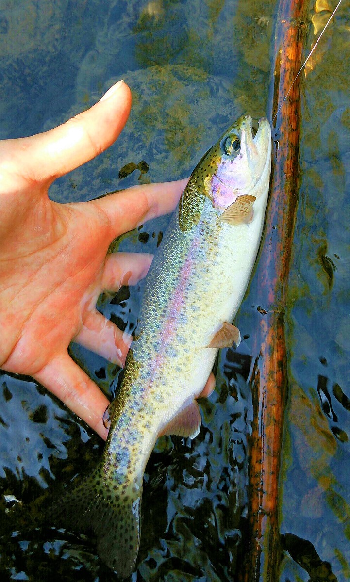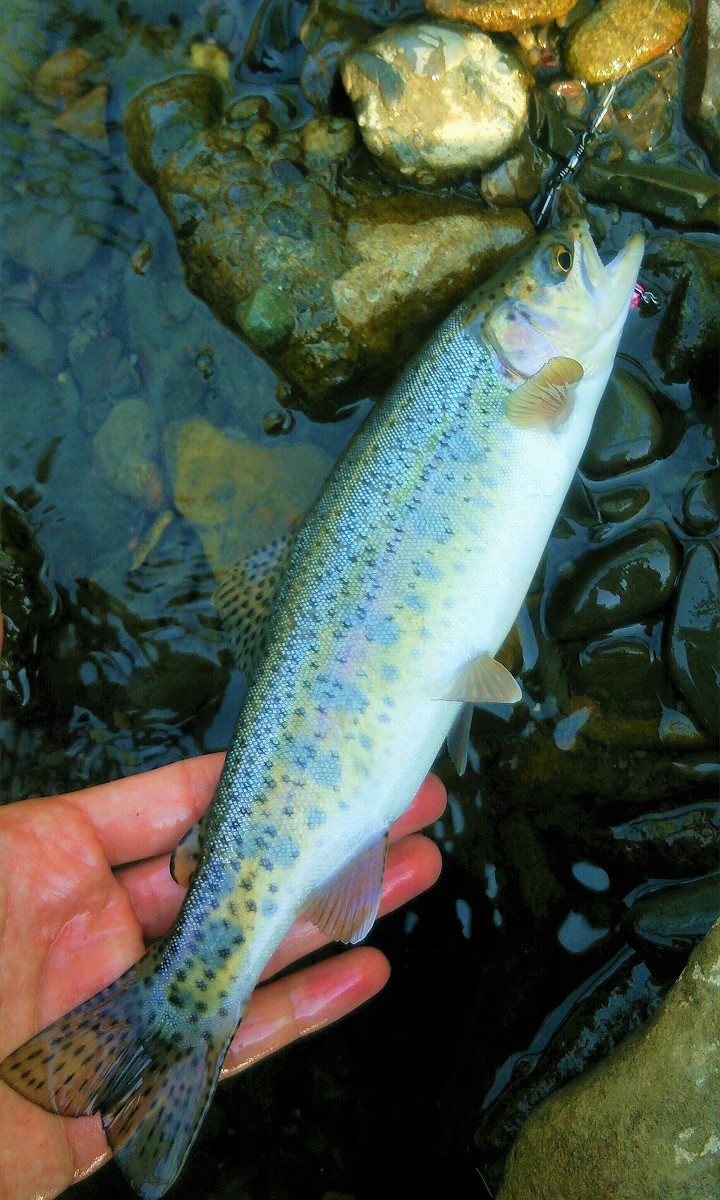 22センチのニジマスがヒット。やはり中流域より型は落ちますが魚影はあります。