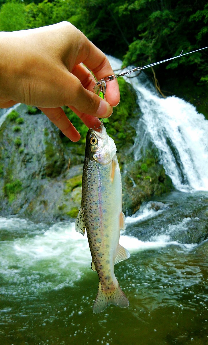 19センチのニジマスがヒット。とりあえず魚がいる事は確認できましたが、魚影はあまり濃くないようですね。大物が釣れそうなビッグポイントも特にない川なので、今日はここで帰宅しました。また機会があれば訪れてみようと思います。魚は全てリリースしました。