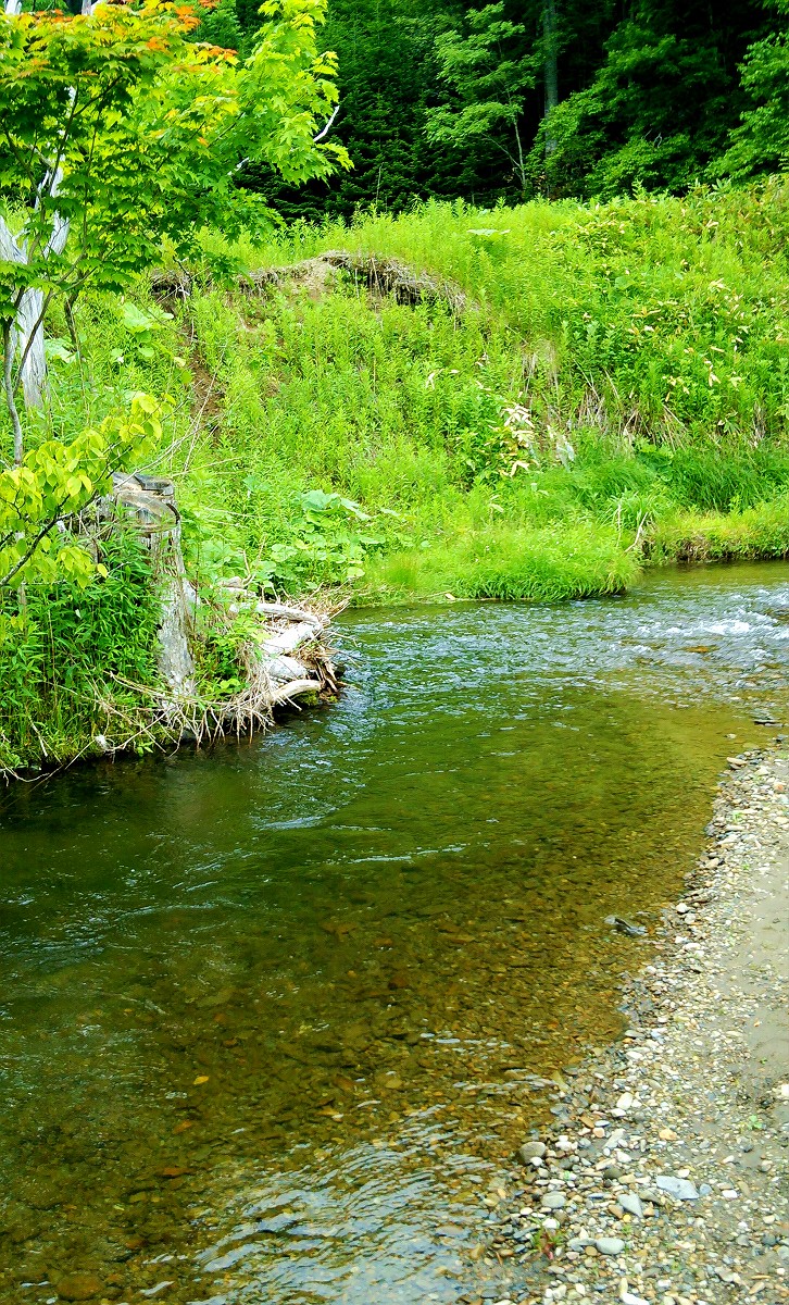 滝の上流は開けた渓相で入渓しやすいですね。そして何故か川岸の樹木は殆ど伐採されており、短い藪に囲まれた不思議な渓相となっています。