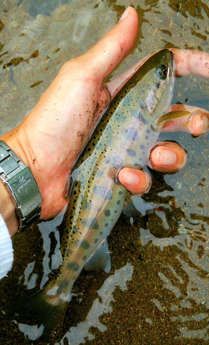 釣れたのはやはりヤマメです。一瞬ニジマスに見えましたが19センチのデブヤマメでした。