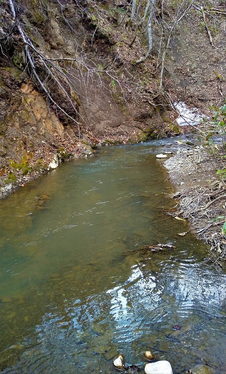 魚類の生息を確認し安心して釣り上がっていくと、川底の岩盤は少なくなり深場が点在しています。写真のポイントでは