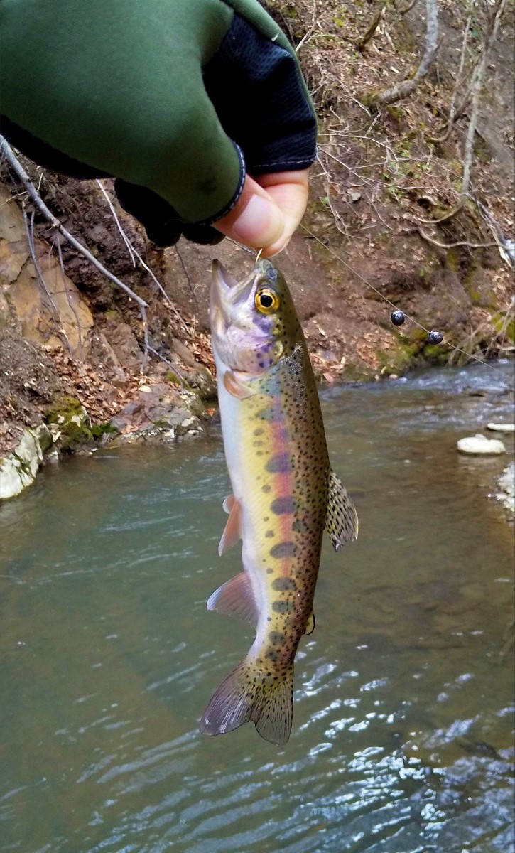 小さなニジマスがヒット。魚影は十分ですが河川規模的に大物は狙えませんね。
