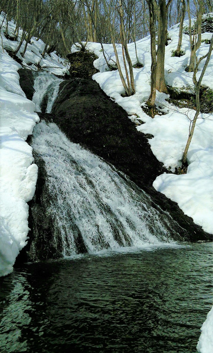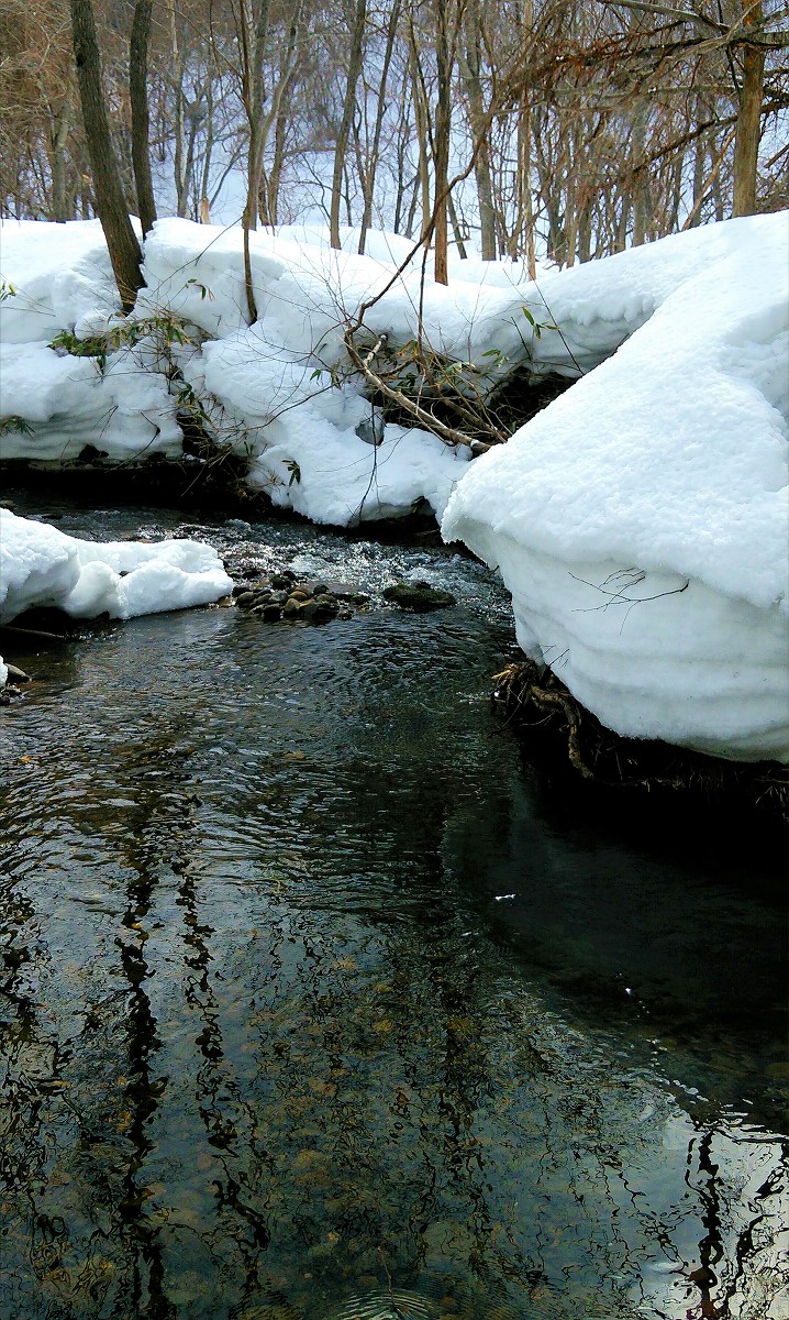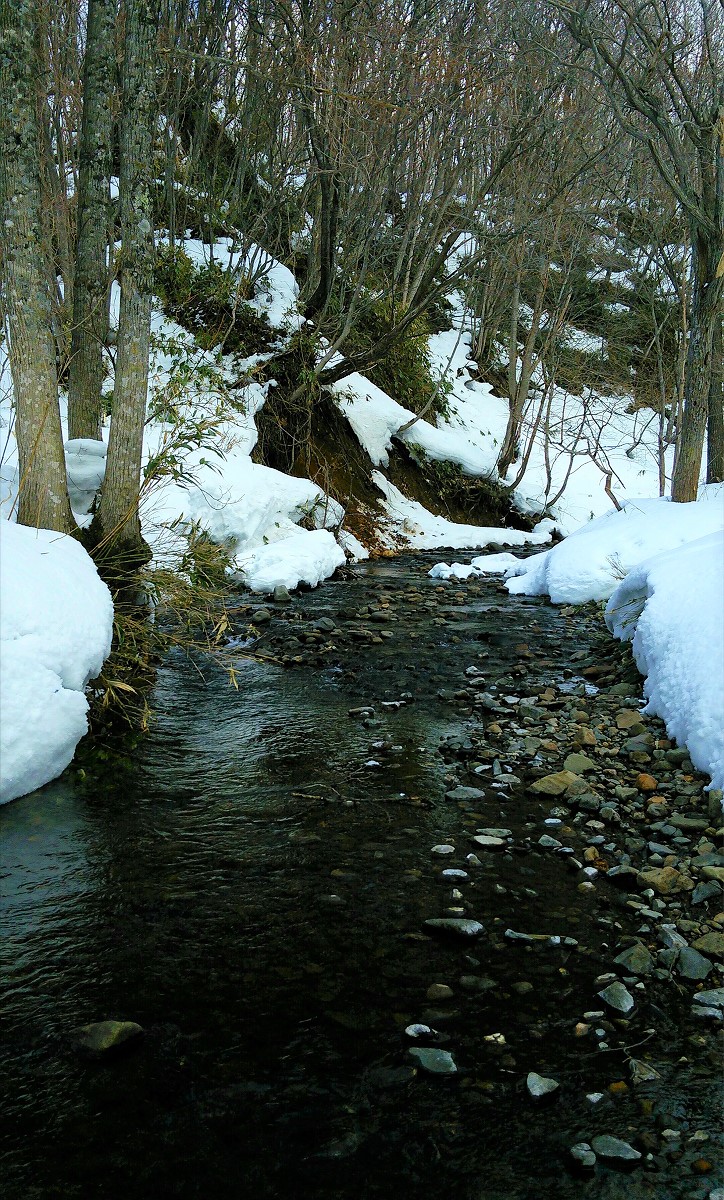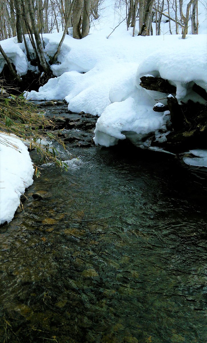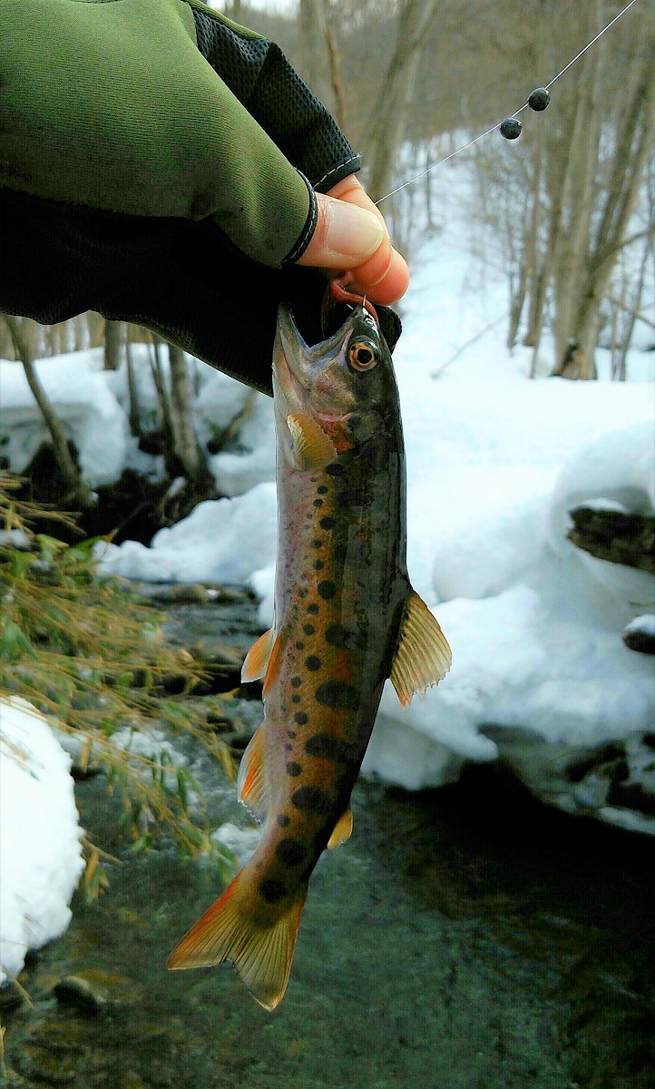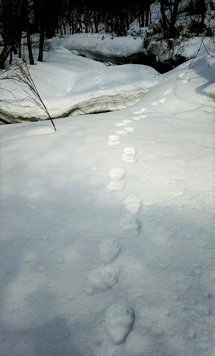 18センチのヤマメでした。しかし坊主を回避し安堵したのも束の間、雪の上に真新しい足跡があります。先行者かと思いきや