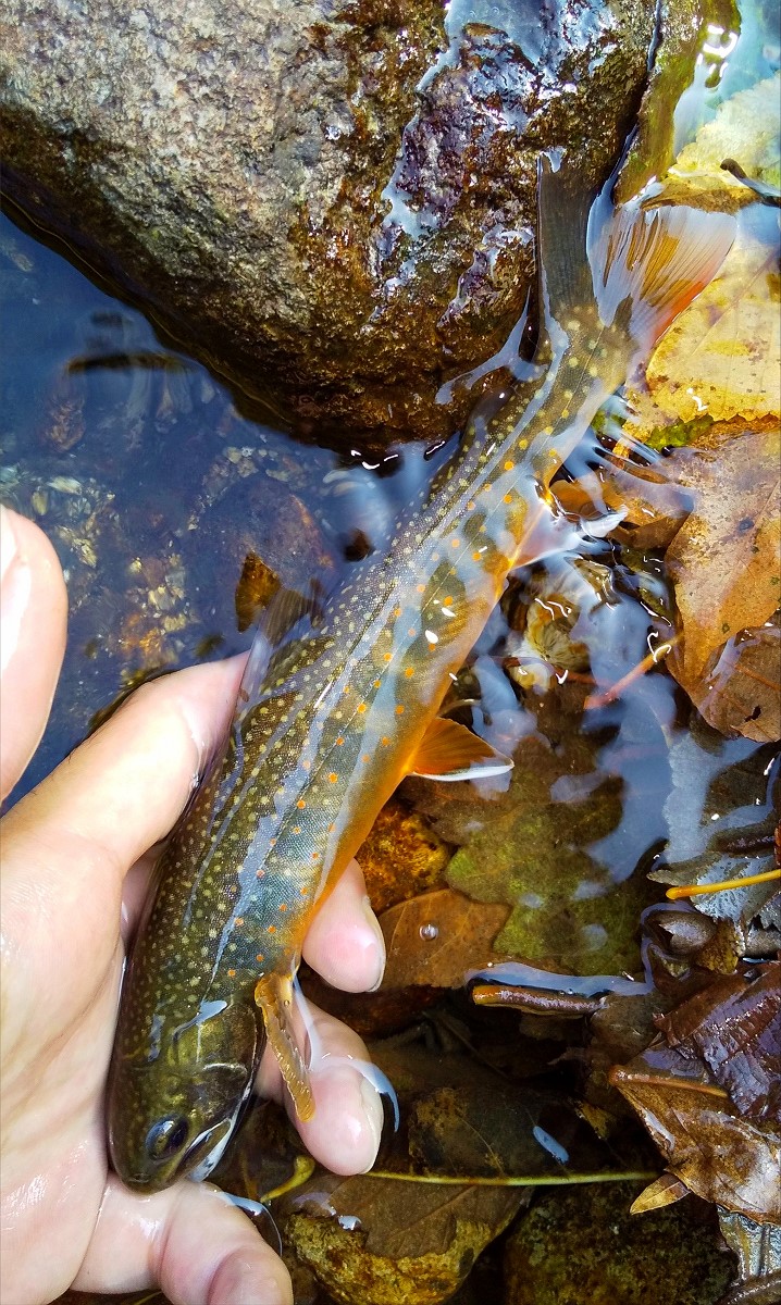 17センチの鮮やかなオショロコマがヒット。情けない話ですが留辺志部川で初めて魚を釣る事ができました。どうやらオショロコマならば上流域で簡単に釣れるようですね。