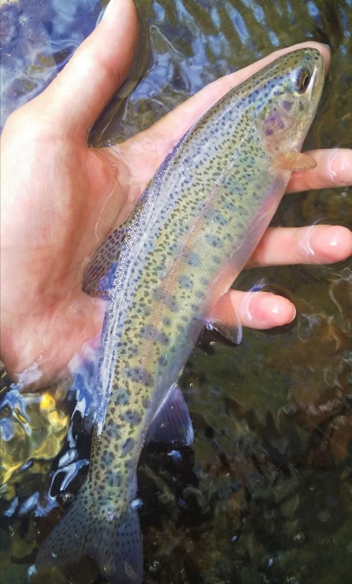 22センチのニジマスがヒット。美笛川でニジマスを見たのは初めてです。目立つ深場よりも流れのあるポイントに魚が付いていますね。