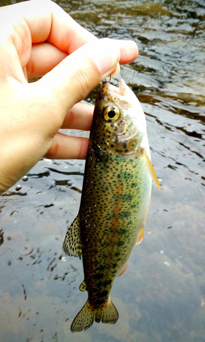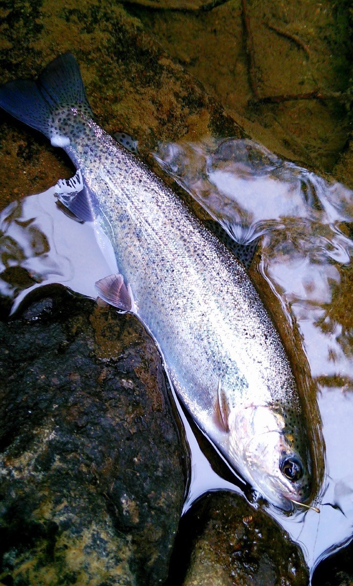 24センチのニジマスがヒット。奇跡的です。やはり滝に挟まれた区間で生息しているため一度逃げても他に深場もなく、同じ場所に戻ってくるようです。今日はこれで満足して帰宅しました。それにしても魚の往来を阻む滝が無数に存在するにもかかわらず魚影があったのは驚きでした。とは言え滝に挟まれた区間の魚は釣り切ってしまえば終わりですから、是非ともリリースを心掛けて頂きたいですね。本当に大変な川でしたが、また機会があれば訪れてみようと思います。魚は全てリリースしました。