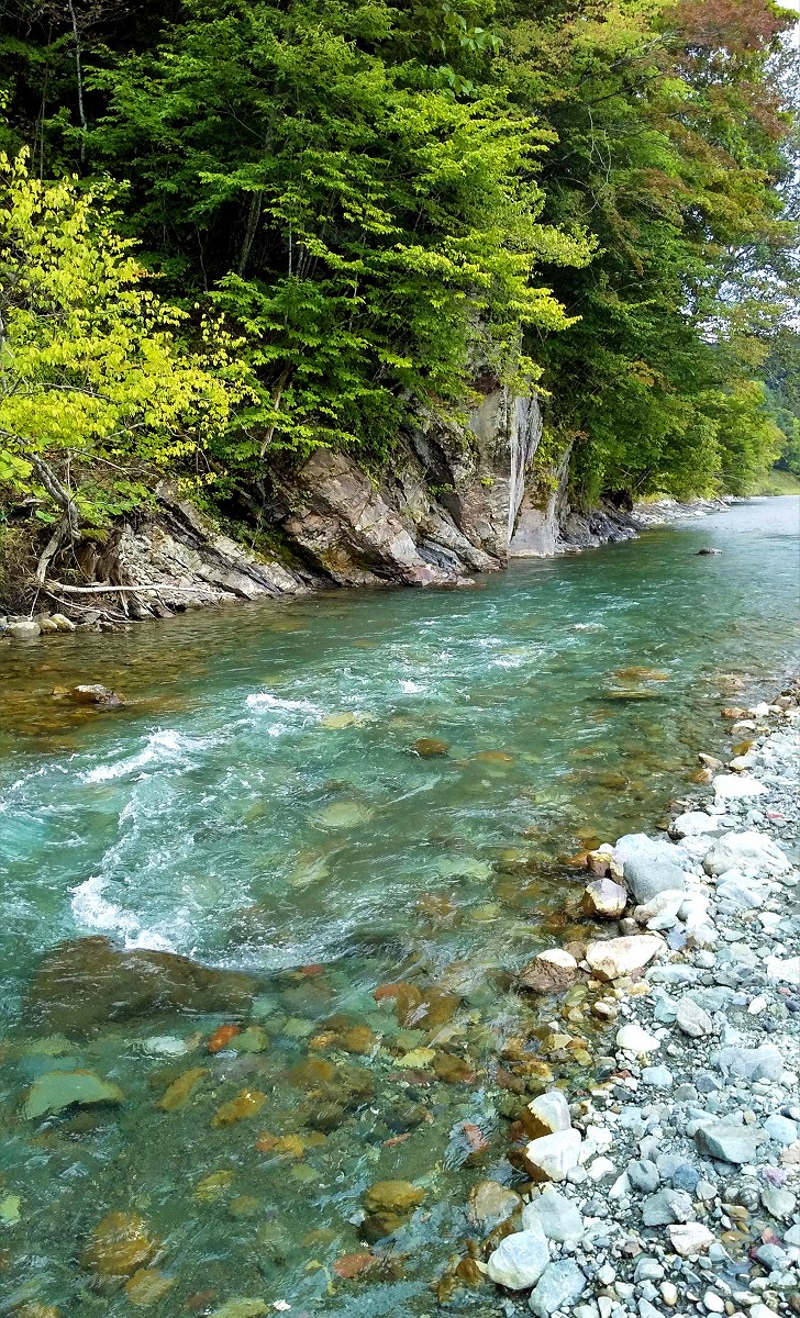 まずは目立つ深場を中心に攻めていくと、黒い魚がチェイスしてきますが針に掛かりません。おそらくイワナかと思いますが、クリアな水質も手伝って手強いですね。