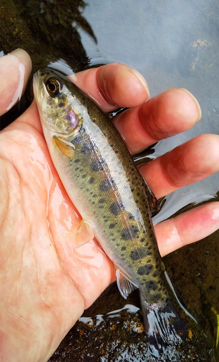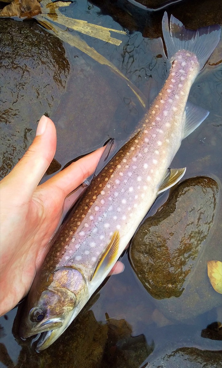 20センチのニジマスがヒット。この川のニジマスは斑点が多くて鮮やかですね。