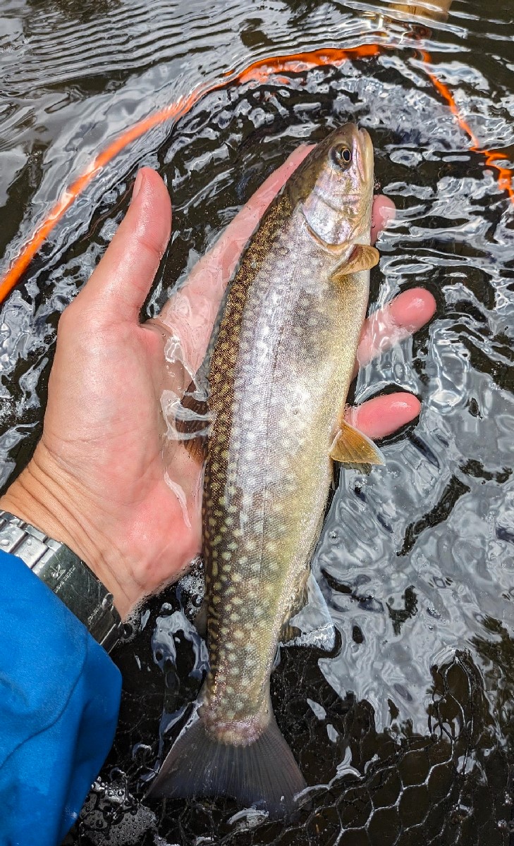 37センチのイワナがヒット。精悍な面構えといい、アイシャドウを塗ったような目の緑色といい、ここ数年見たイワナの中で一番美しいですね。しかも過去にワッカタサップ川で釣れた魚では最大サイズです。