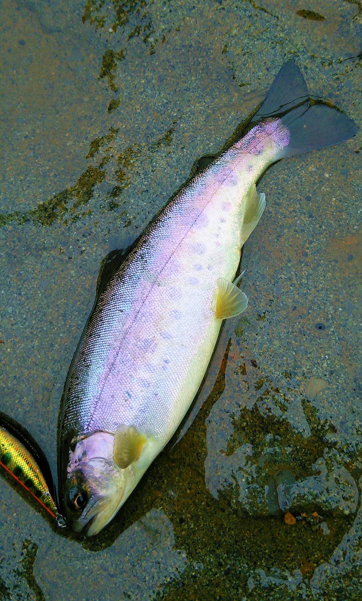 22センチのニジマスがヒット。苦労して入渓した割には小さいですね。ちなみにこのポイントは禁漁期間中のヤマメのチェイスも数回ありましたが、運良くギリギリで見切られました。意外にヤマメの魚影もあるみたいですね。