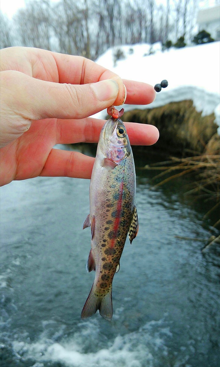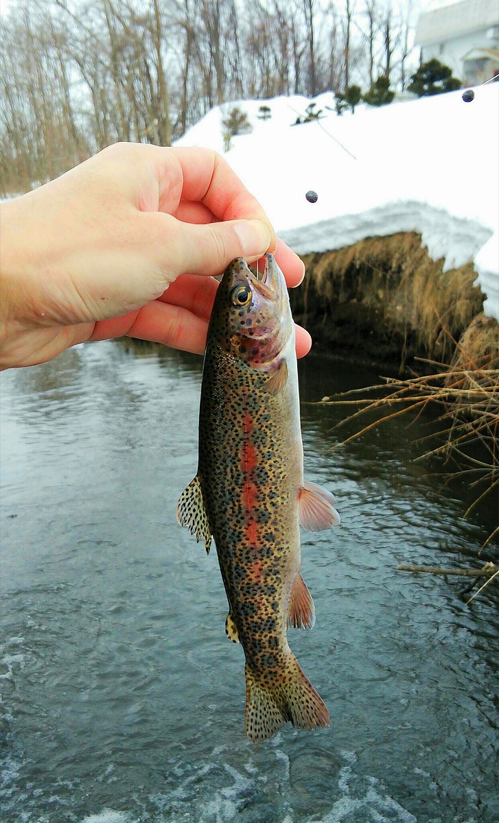 釣れたのは21センチのニジマスでした。ちゃんとした渓流魚が釣れて自分でもビックリです。さらに続けて