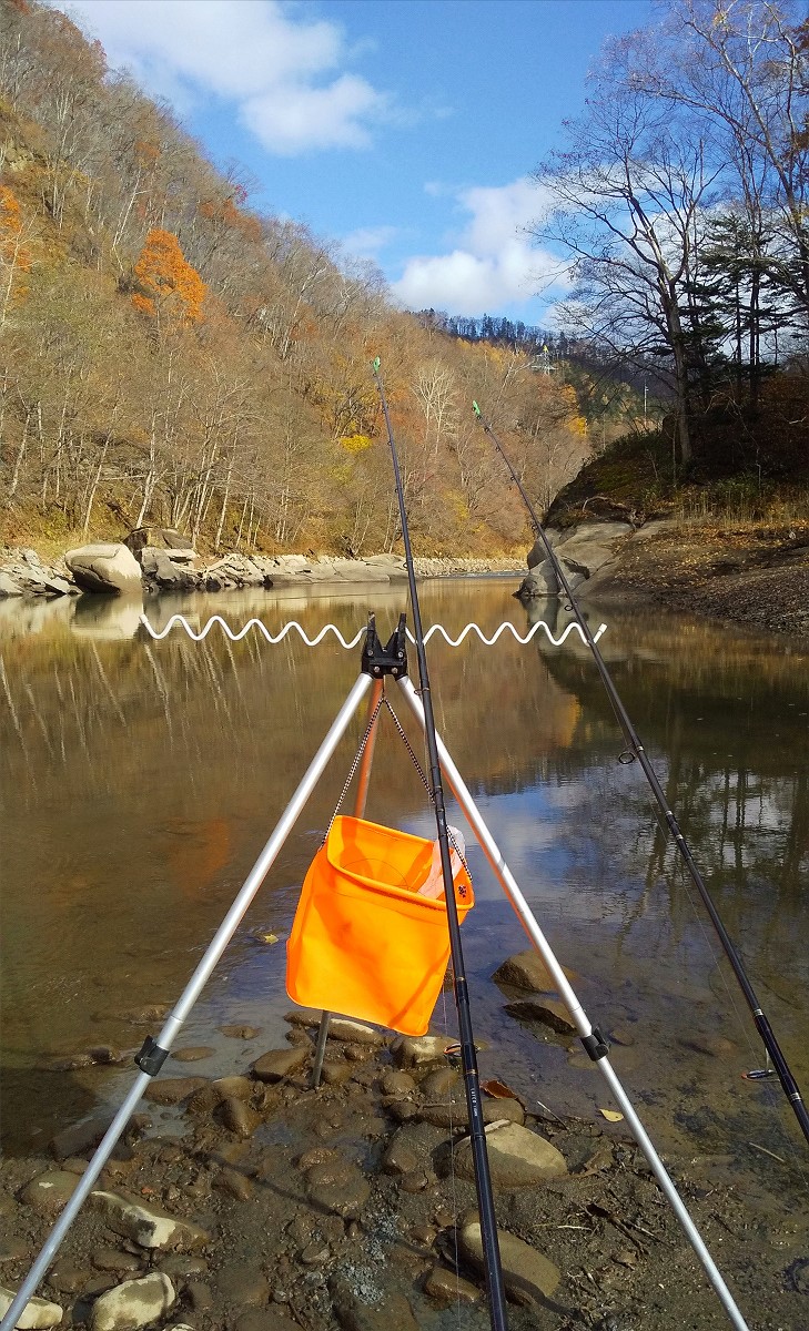 今日は夕張市を流れる夕張川で釣りをしてきました。まず最初に訪れたのは以前調査して坊主だった川端ダムです。川端ダムは普段濁りが酷く釣りの対象外ですが、10月以降に水が抜かれると若干水質が良くなります。しかし前回は渓流魚の魚影が皆無で、唯一視認できたのは湖育ちの巨大コイのみでした。という訳で今日は巨大コイを狙ったぶっこみ釣りに挑戦します。