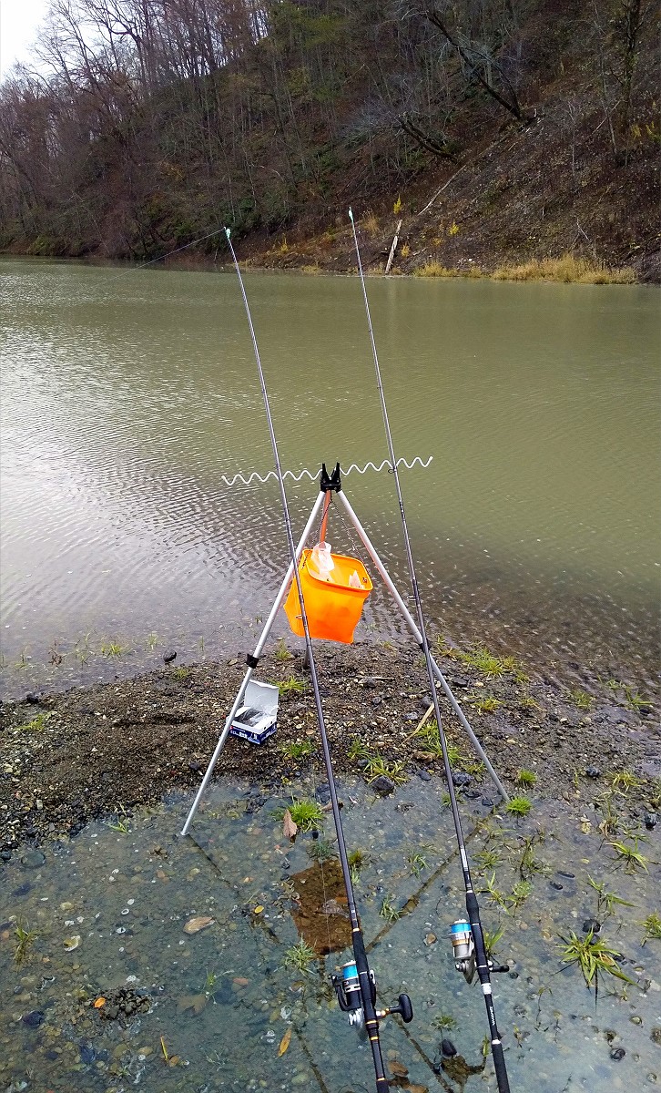 入釣地点から少し遡行し、前回巨大コイが泳いでいた場所に三脚をセット。ダイワのラブラックスとラテオが淡水ぶっこみ釣りに使われるなんて、メーカーは想定外だろうなと思っているとアタリがありました。掛かっていたのは
