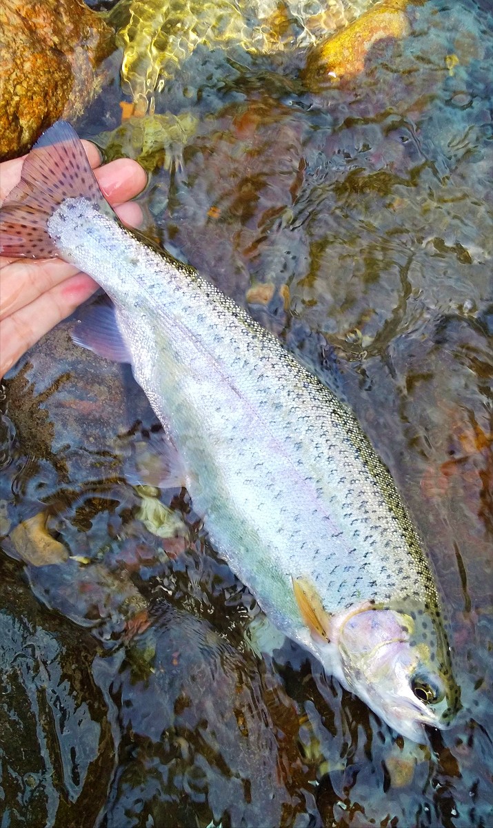 32センチの極太ニジマスでした。天人峡の激流に育まれた見事な魚体ですね。この筋肉質なボディを見れば、尺クラスとは思えないパワーも納得です。さらに続けて