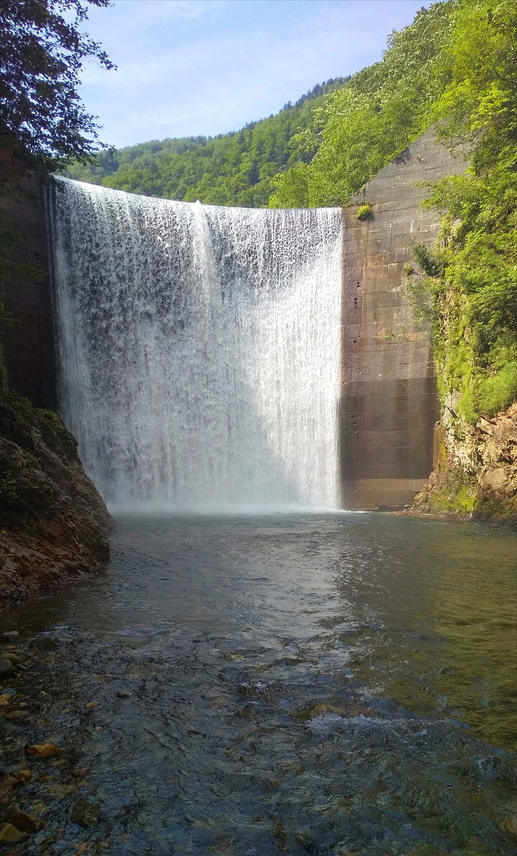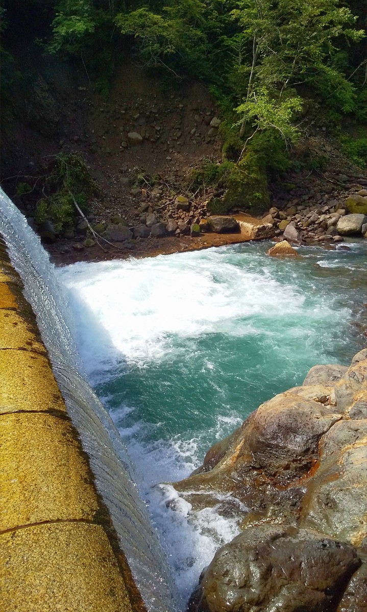 合流地点から「日本一美しい沢」の呼び声高いクワウンナイ川に釣り上がっていくと、すぐに巨大砂防ダムがあります。砂防下は巨大な深場となっていますが、激流に水飛沫が吹き荒れており魚は釣れませんでした。諦めて戻りましょう。