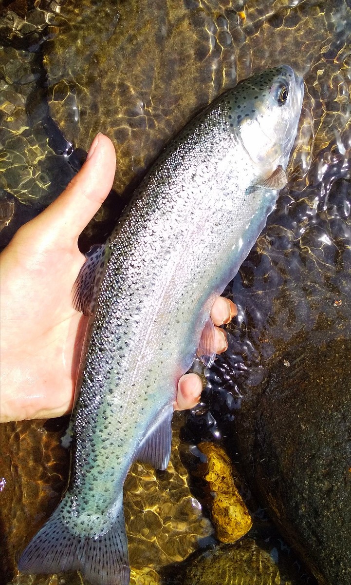 26センチの青白いニジマスがヒット。ブルーバックレインボーとまでは言えませんが、忠別川の美しい水色を体現したような魚体が目を引きます。