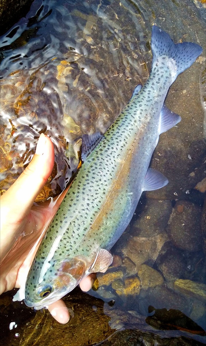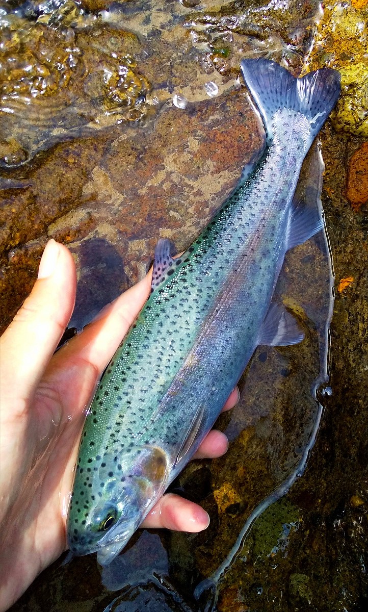その後も見事な渓相を楽しみつつポイントに仕掛けを投入していくと、今度は青い水面に青い魚影が輝きました。掛かっていたのは