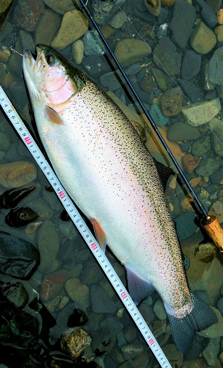 モンスターレインボーと呼ぶに相応しい56センチの極太ニジマスでした。渓流釣りを始めて以来これほどの怪物に出会った事はありません。しかし何より驚異的なのは異様とも言える太さと完璧な魚体です。日本の自然河川でこれほど見事な魚体が育まれる事が信じられません。