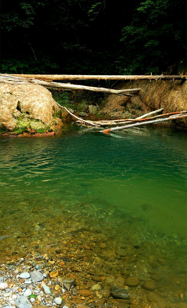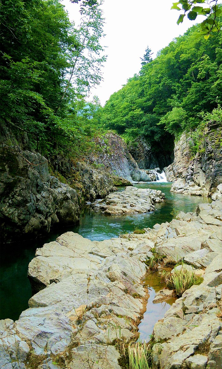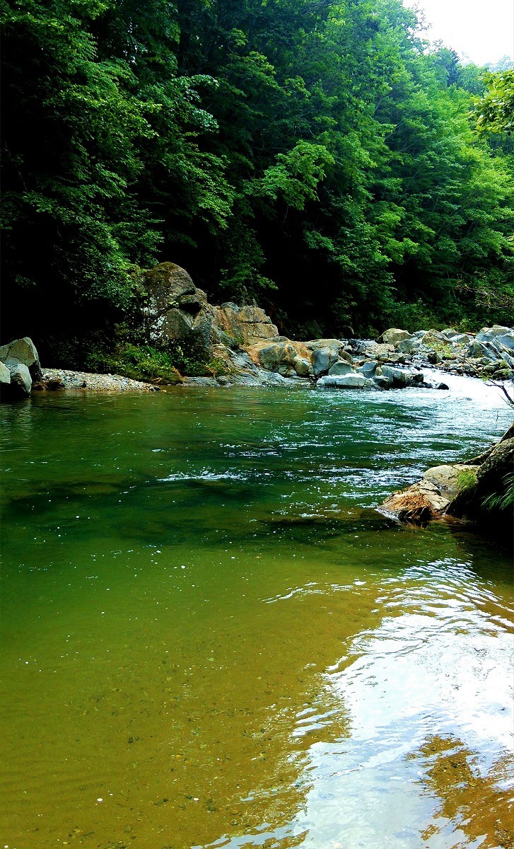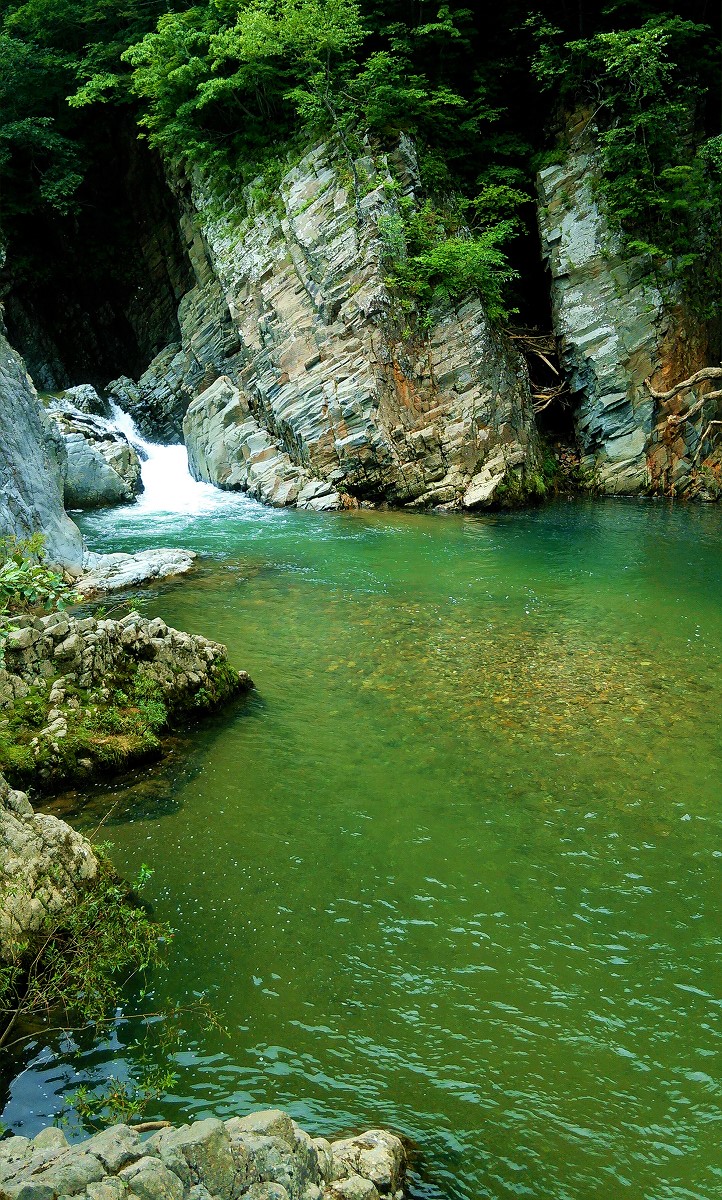 それでも釣り上がっていくと徐々に遡行に難儀する渓相になっていき、釣り人の足跡も目立たなくなってきました。そして写真の深場に仕掛けを投入すると良いアタリがあり、