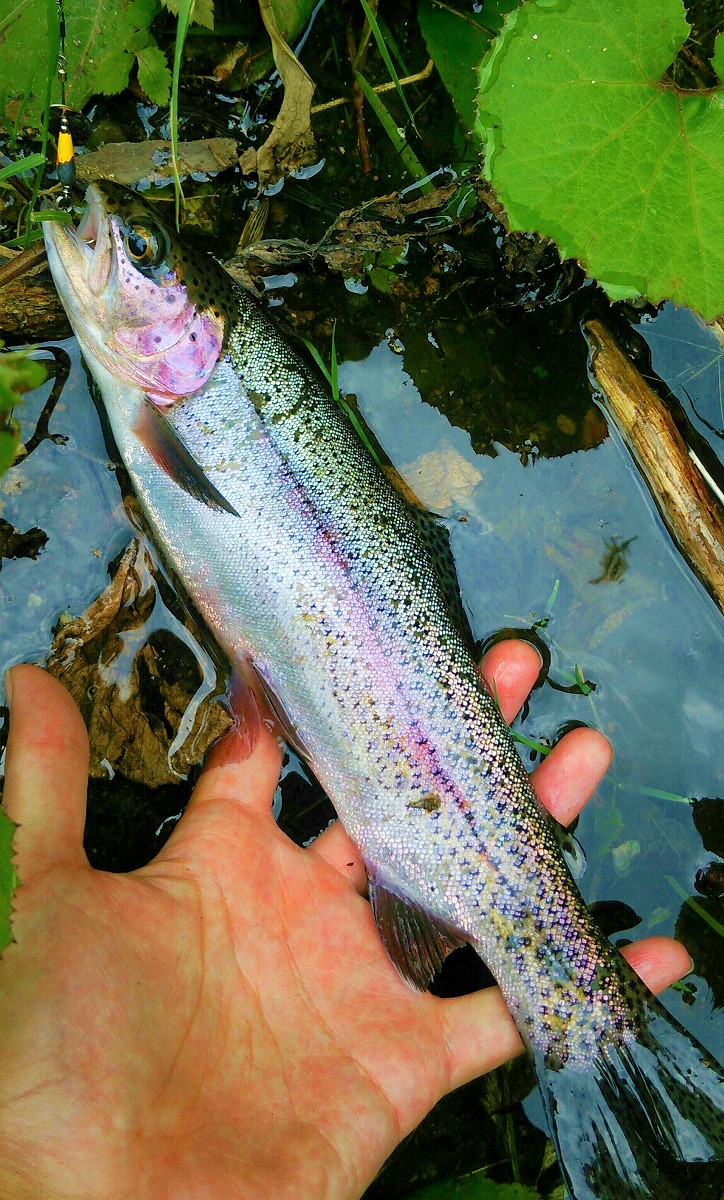 小さなニジマスがヒット。人気河川の巨大魚は賢いので、騙せるのは小さい魚だけですね。