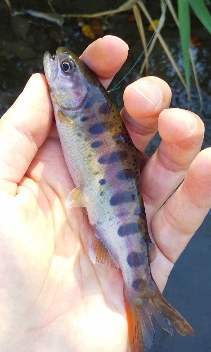 19センチの鮮やかなニジマスがヒット。周りは住宅街なので釣り切られていそうですが、スレてはいるものの魚がいました。ここから上流に釣り上がってみましょう。