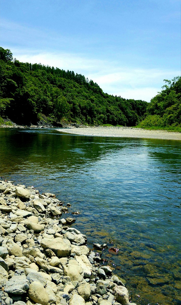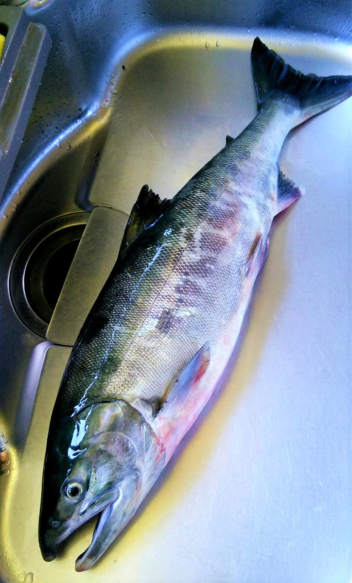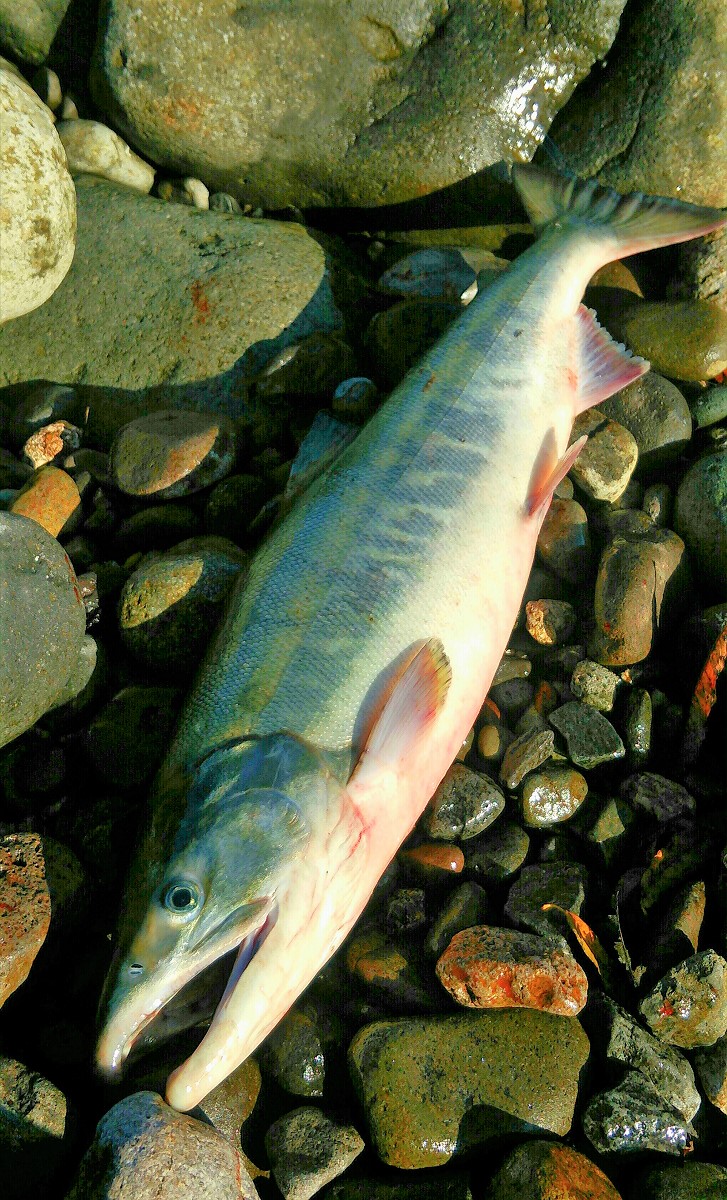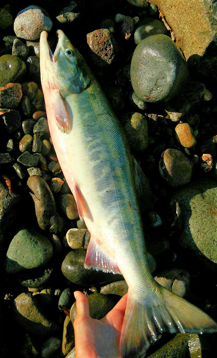 そして目立ったアタリもないまま午前7時を過ぎ、大分日も照ってきました。諦めの早い人は既に帰宅し私も殆ど諦めかけていたその時、なんとサケ特有のモゾモゾとしたアタリが。はやる気持ちを抑えて数秒後アワセると、確かな手応えと同時に圧倒的なパワーでサケが暴れ始めました。今回はサケ専用のヘビータックルではなく支笏湖用のタックルを代用しているので無理はできません。さらにゴロタ場でランディングが上手くいかず、岸に寄せては沖に走られを繰り返しやっとの思いで上がってきたのは