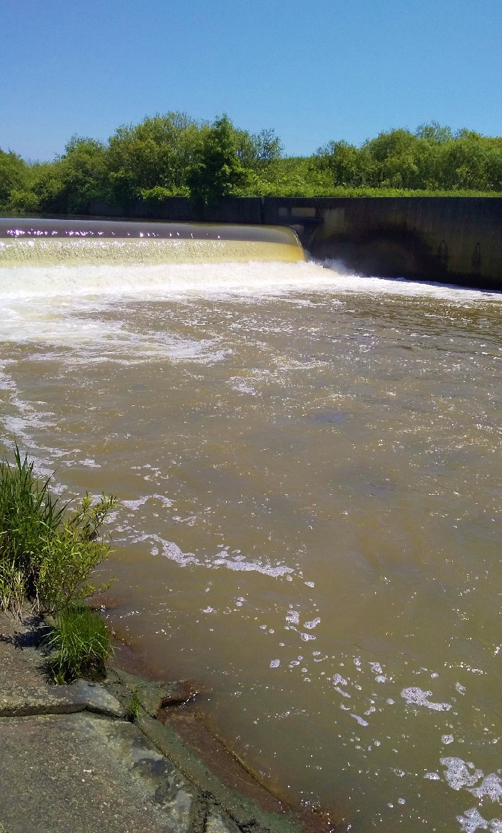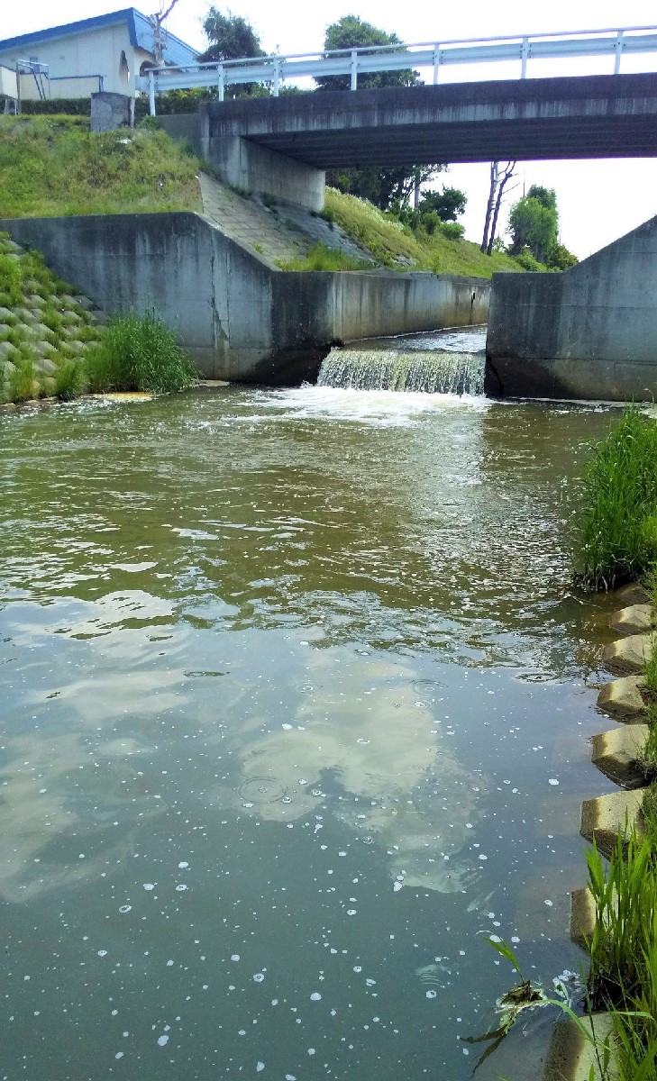 最後に向かったのは千歳川との合流地点から程近い人工の滝です。最下流部は周辺の農業排水が集中し凄い水量ですね。ウグイやコイが滝を越えようと跳ねているので、千歳川から遡上したビッグワンを期待していると猛烈なアタリが。コイかと思いきやクネクネするので巨大ウグイでしょうか。しかしウグイらしからぬ激しい抵抗に困惑していると、