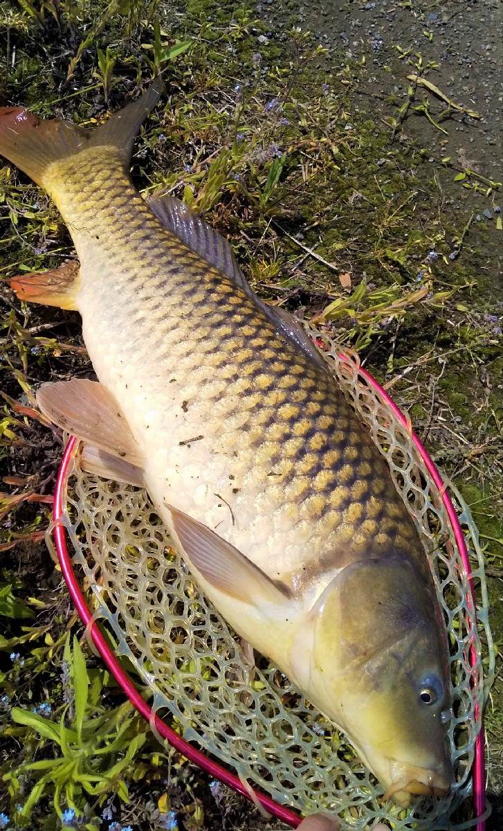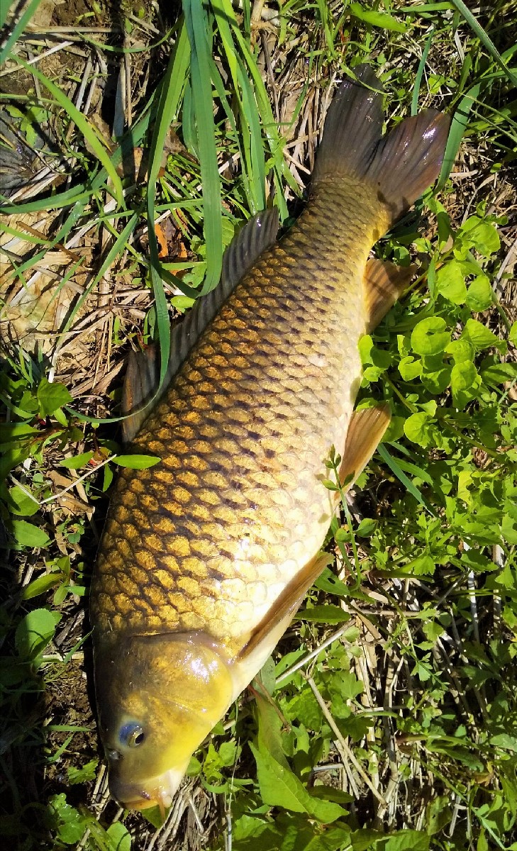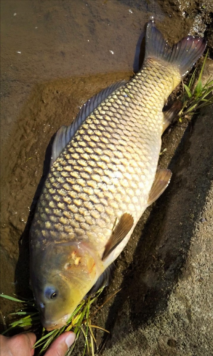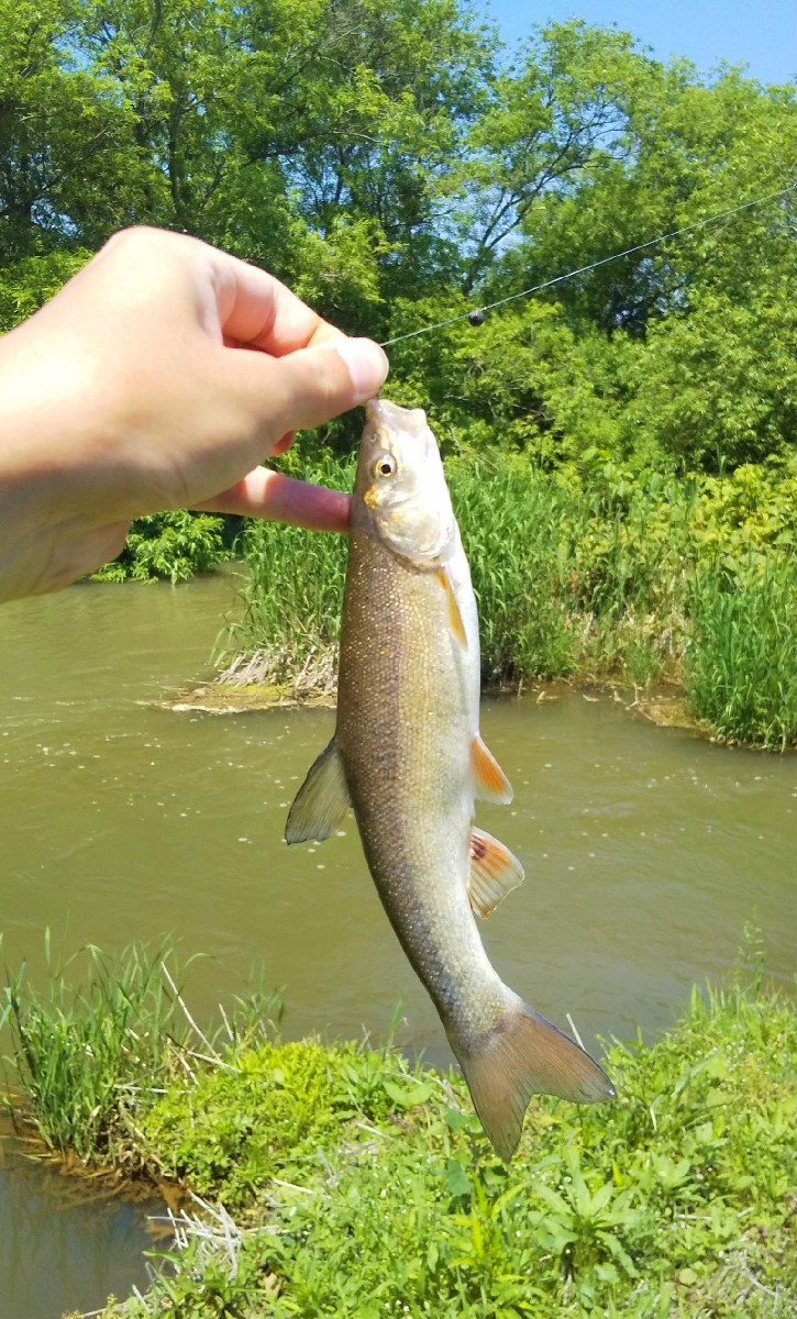 合流地点を覗いてみると大きなコイが泳いでいますね。針や糸をチェックして慎重に仕掛けを投入すると、何やらコイっぽくない鋭いアタリが。上がってきたのは