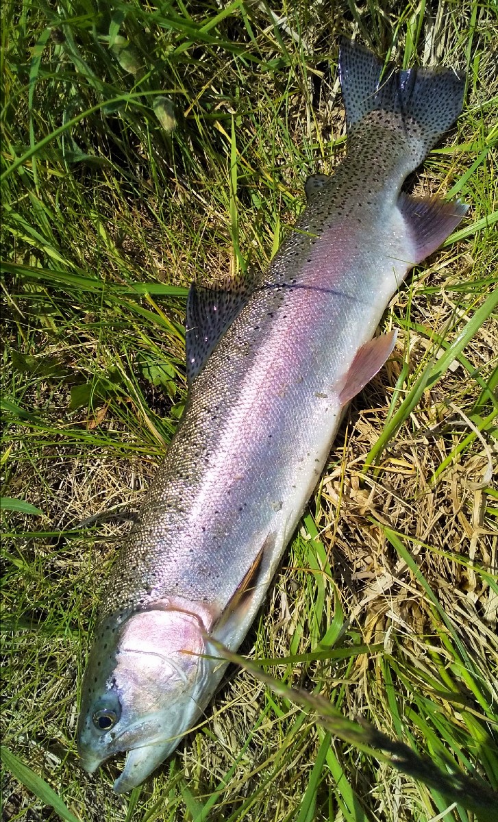 目を疑うような巨大ニジマスが姿を現しました。私はあまりの出来事に「マジか」と絶叫するしかありませんでした。河原がないので素早く草の上で計測すると、サイズは驚異の55センチ。農業排水で濁った川に千歳川から巨大ニジマスが遡上するとは誰も思いません。しかし今日はコイ用のヘビータックルだったので冷静に対処できました。