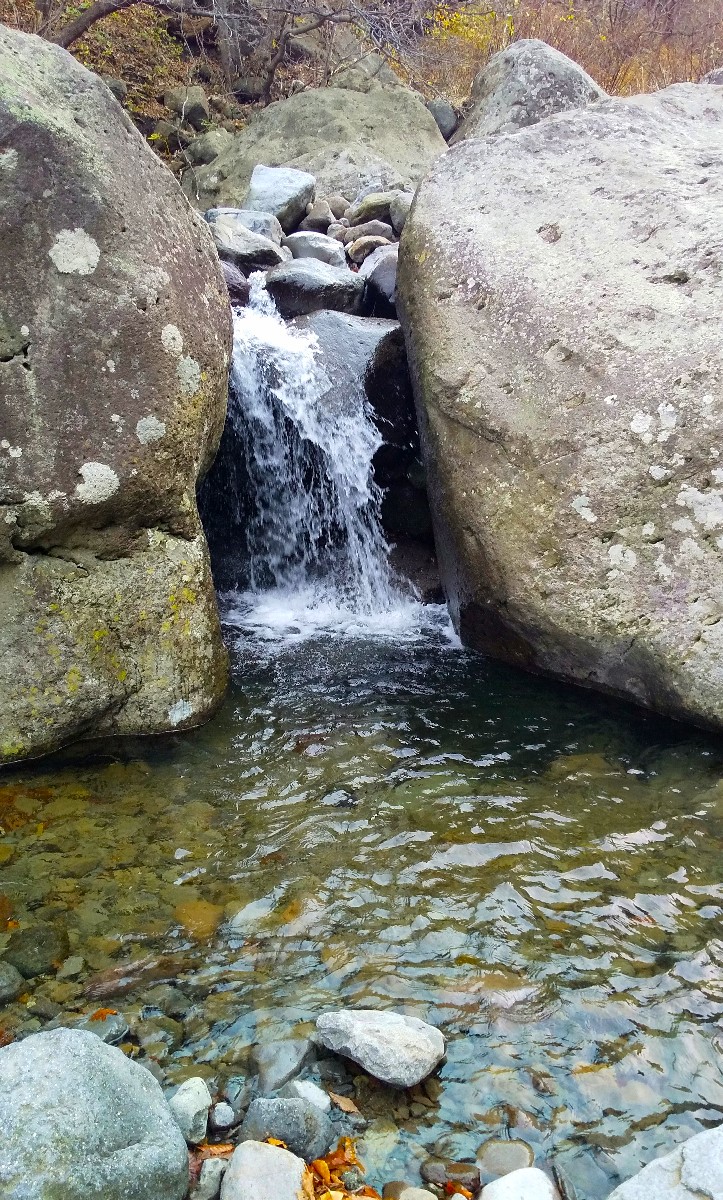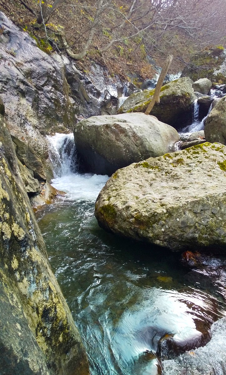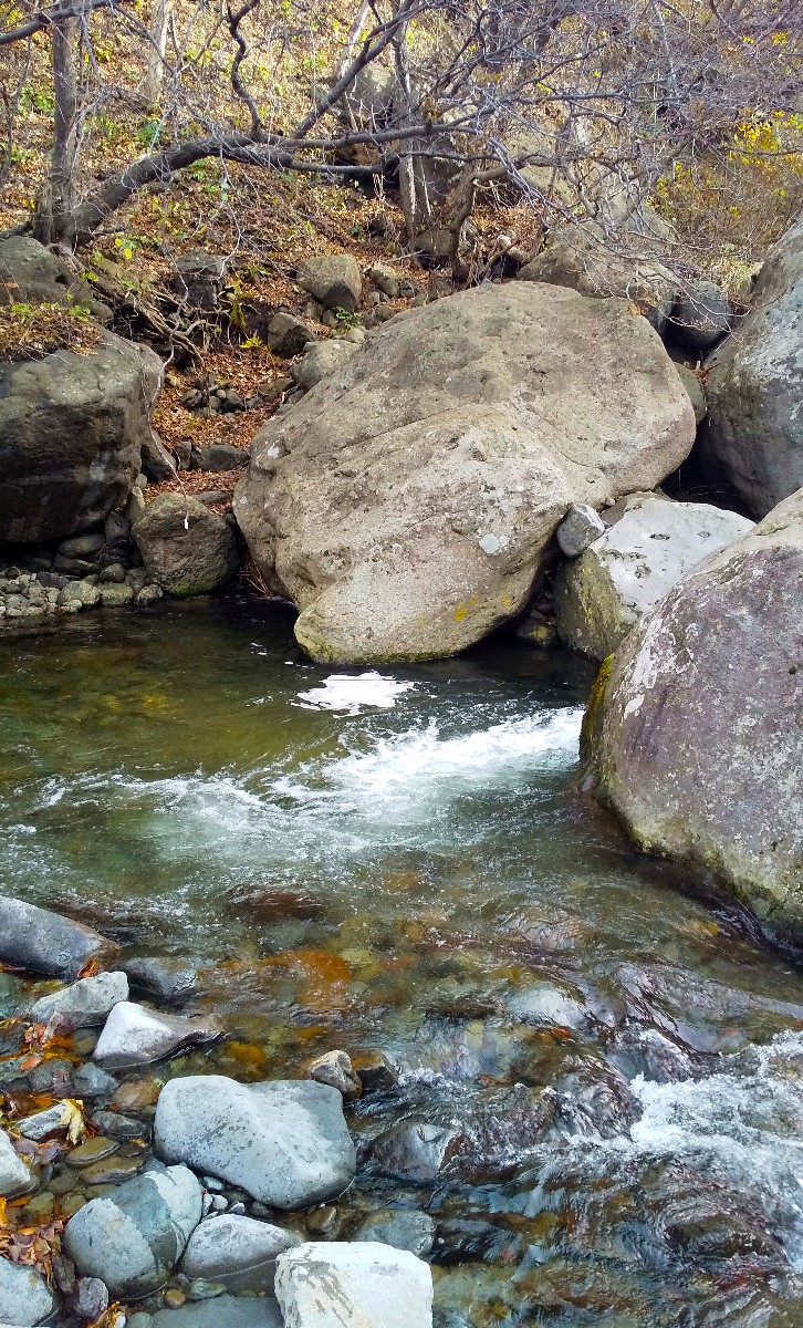 落石や滑落に十分注意しながら慎重に遡行すると、大岩に挟まれた深場を発見。仕掛けを投入するとすぐにアタリがあり