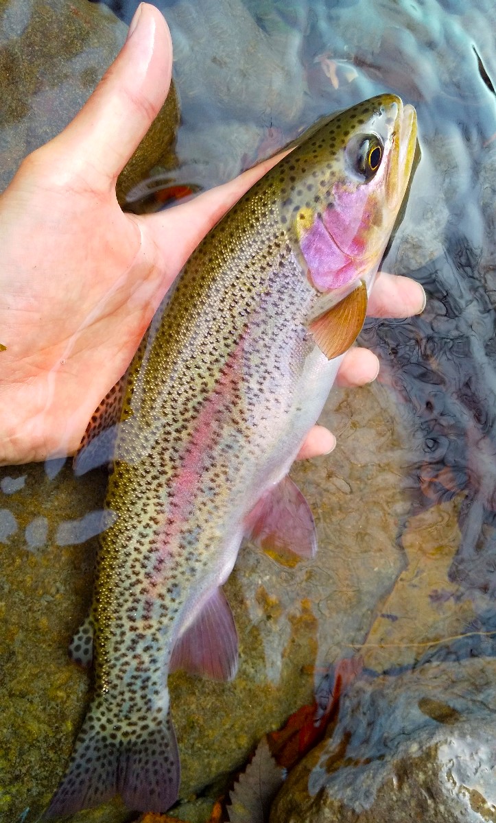 体高がある30センチのニジマスがヒット。あまり大きな深場がない渓相を考慮すると十分良型ですね。