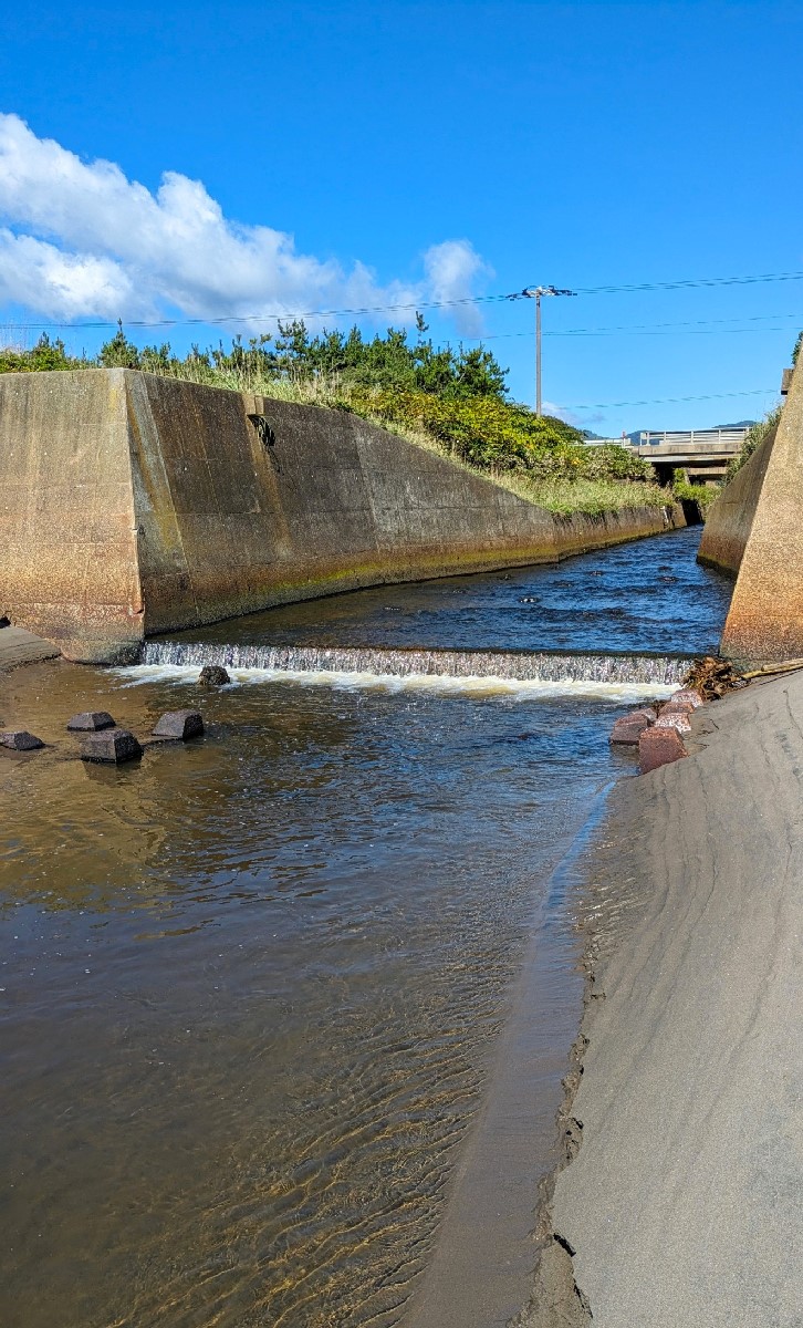 今日は長万部町を流れるナイベコシナイ川で釣りをしてきました。まずは河口を覗いてみると、サケやサクラマスなどの遡上魚は見当たりません。砂浜の上流は三面護岸ですね。