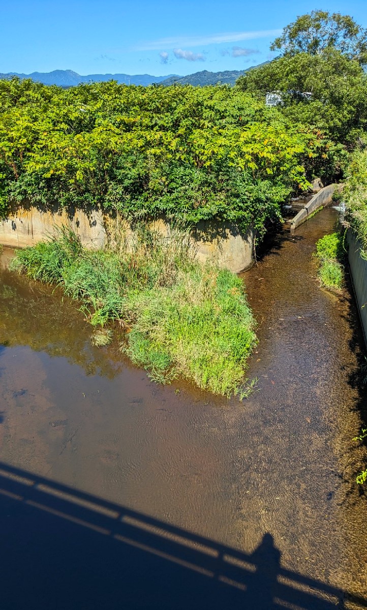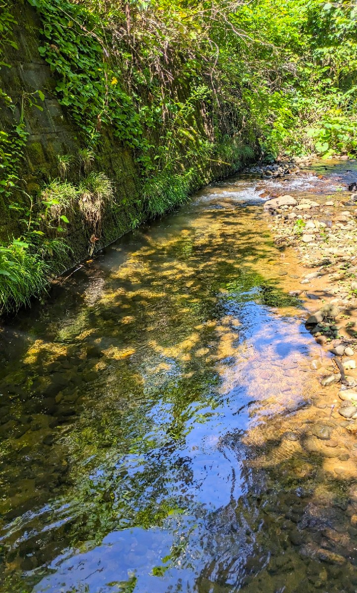 上流域でも川底は若干茶色いものの、コンクリート固めの下流域からは想像できない清流です。釣り上がると幸先良く