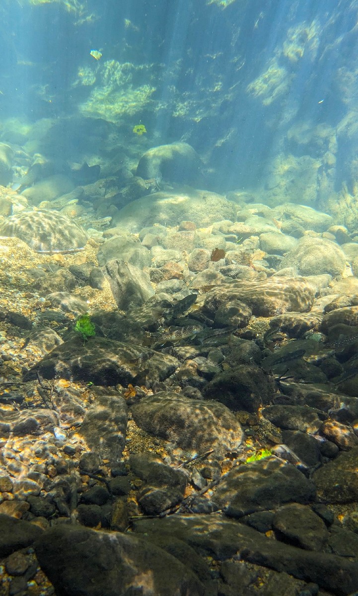 水中を撮影するとイワナとヤマメが仲良く混泳していました。左奥の比較的大きな魚影は今リリースした尺イワナでしょうか。いずれにしても極端な大物は見当たらないので、今日はここで帰宅しました。コンクリート固めの下流域を除けば環境は悪くないので、また機会があれば訪れてみようと思います。魚は全てリリースしました。