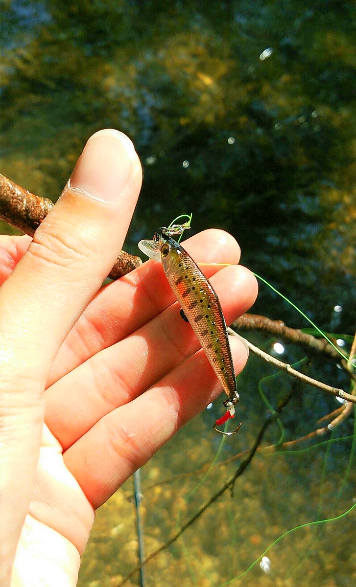 ルアーが木に引っ掛かっていました。Dコンタクトという1500円くらいのシンキングミノーですね。やはりある程度釣り人が入っているみたいです。