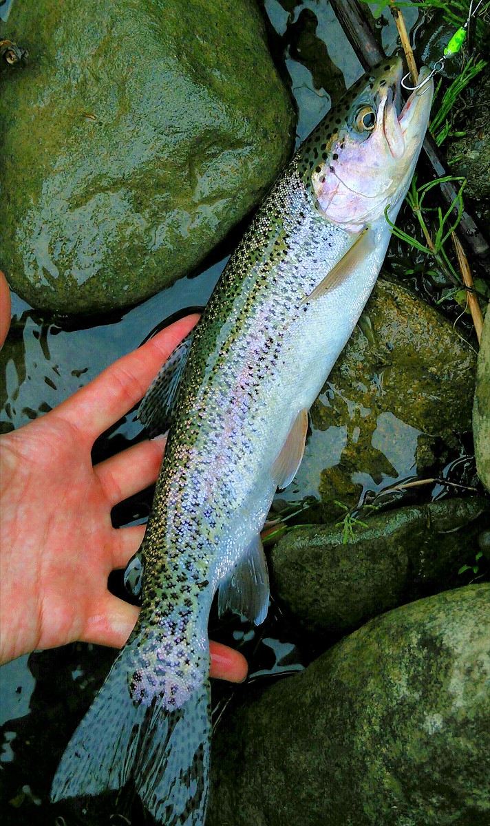 35センチの良型ニジマスがヒット。なかなか良い面構えをしていますね。ただ口に傷があったので過去に釣られた事があるのかもしれません。思いのほか釣り人の影を感じる1日となりましたが、スレた魚も無事回収できたので今日はここで帰宅しました。また機会があれば訪れてみようと思います。魚は全てリリースしました。